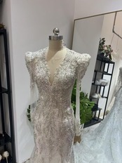 贅沢!ウエディングドレス オフホワイト 韓国風ドレス ロングスリーブ Vネック 編み上げ マーメイドライン キラキラドレス 結婚式