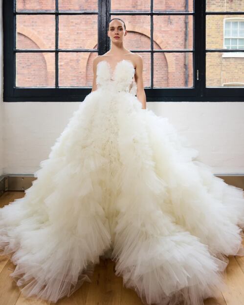 ウエディングドレス オフホワイト ベアトップ ソフトチュール 憧れのドレス 華やかなトレーン セクシー 結婚式