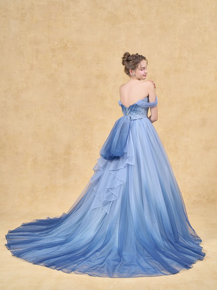カラードレス ブルー キラキラグリッターチュール キラキラ光る刺繍 オフショルダー グラデーションドレス 華やかなトレーン 音楽会