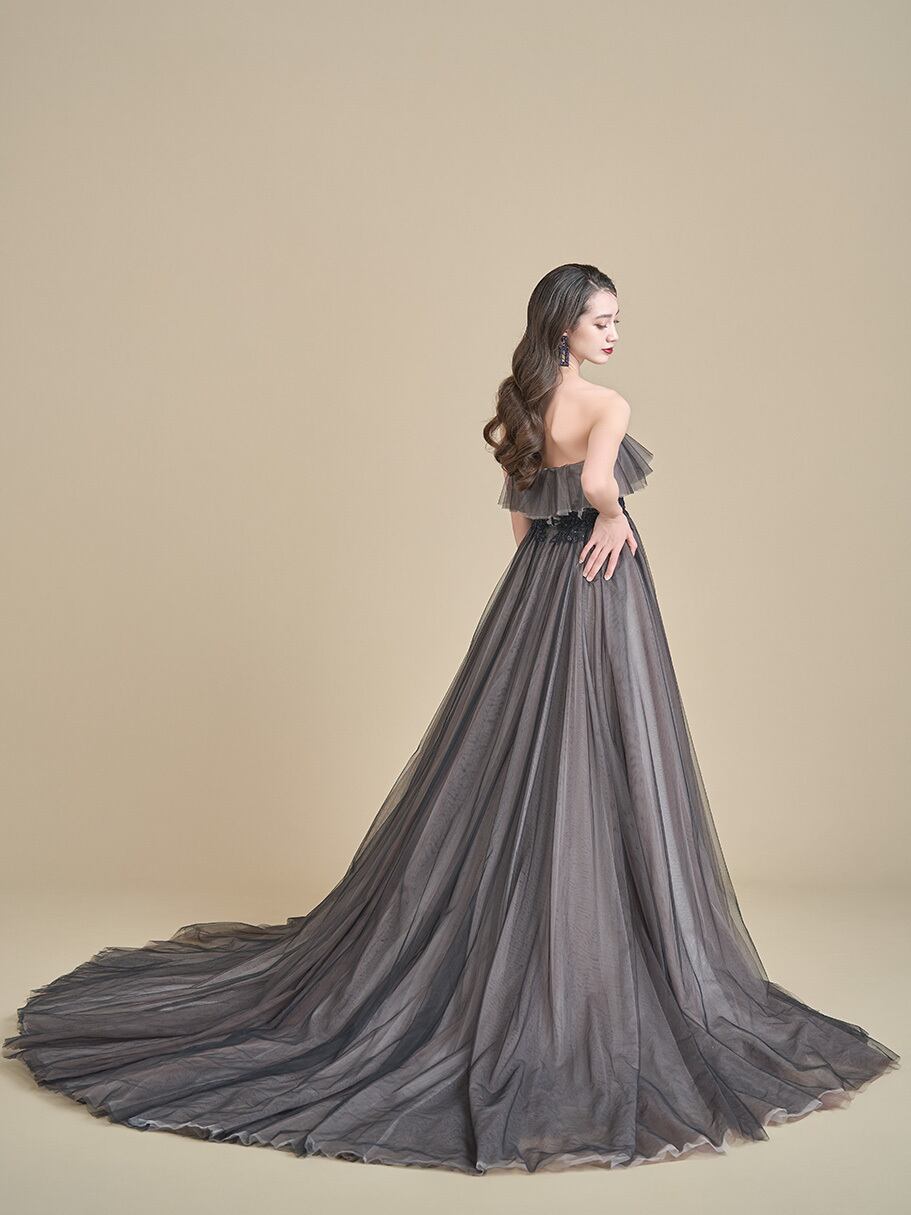 カラードレス ブラック ベアトップ 裾に繊細レースをあしらった ソフトチュール トレーン ピアノ演奏会/音楽会