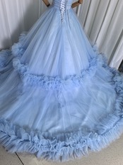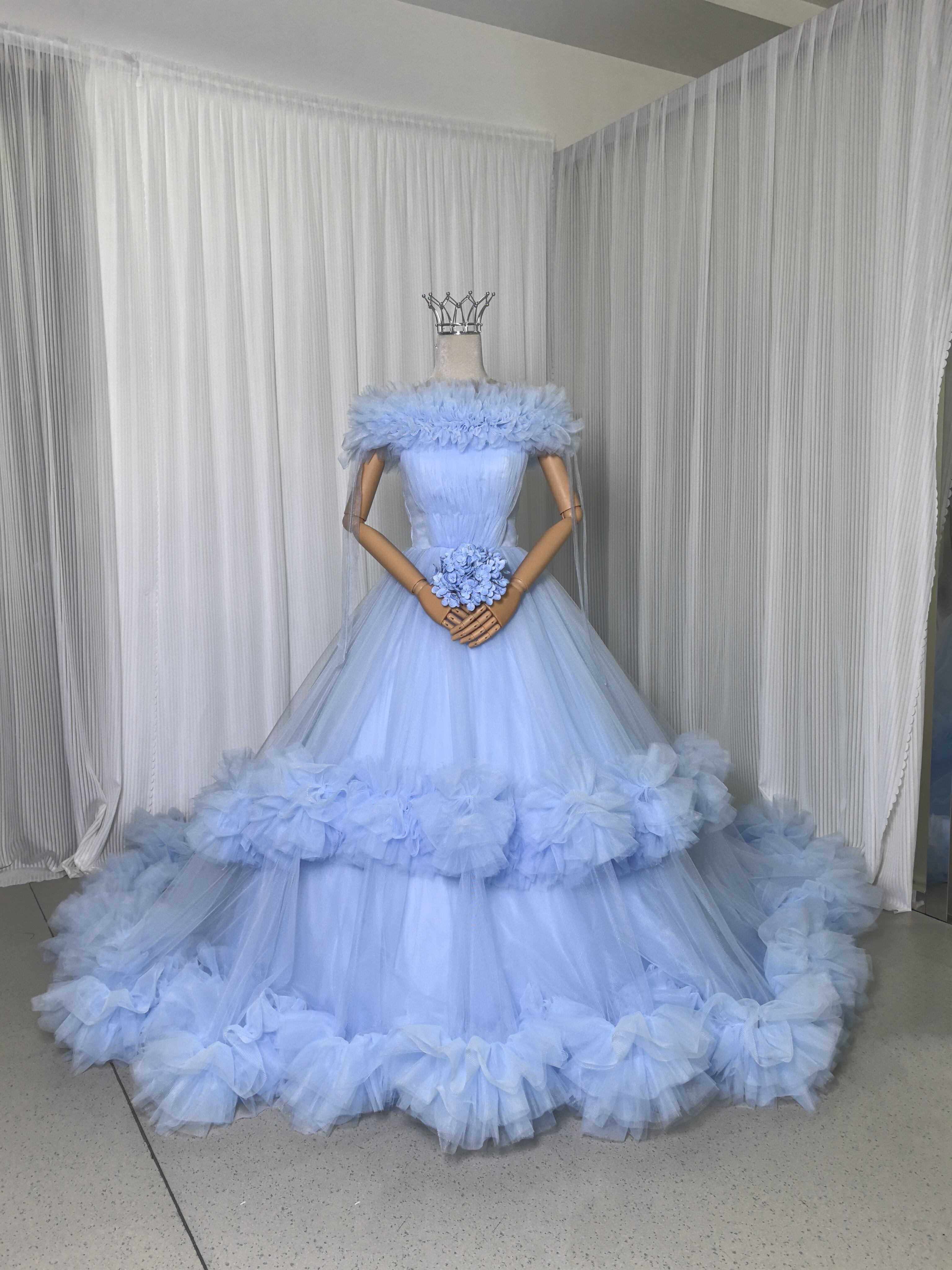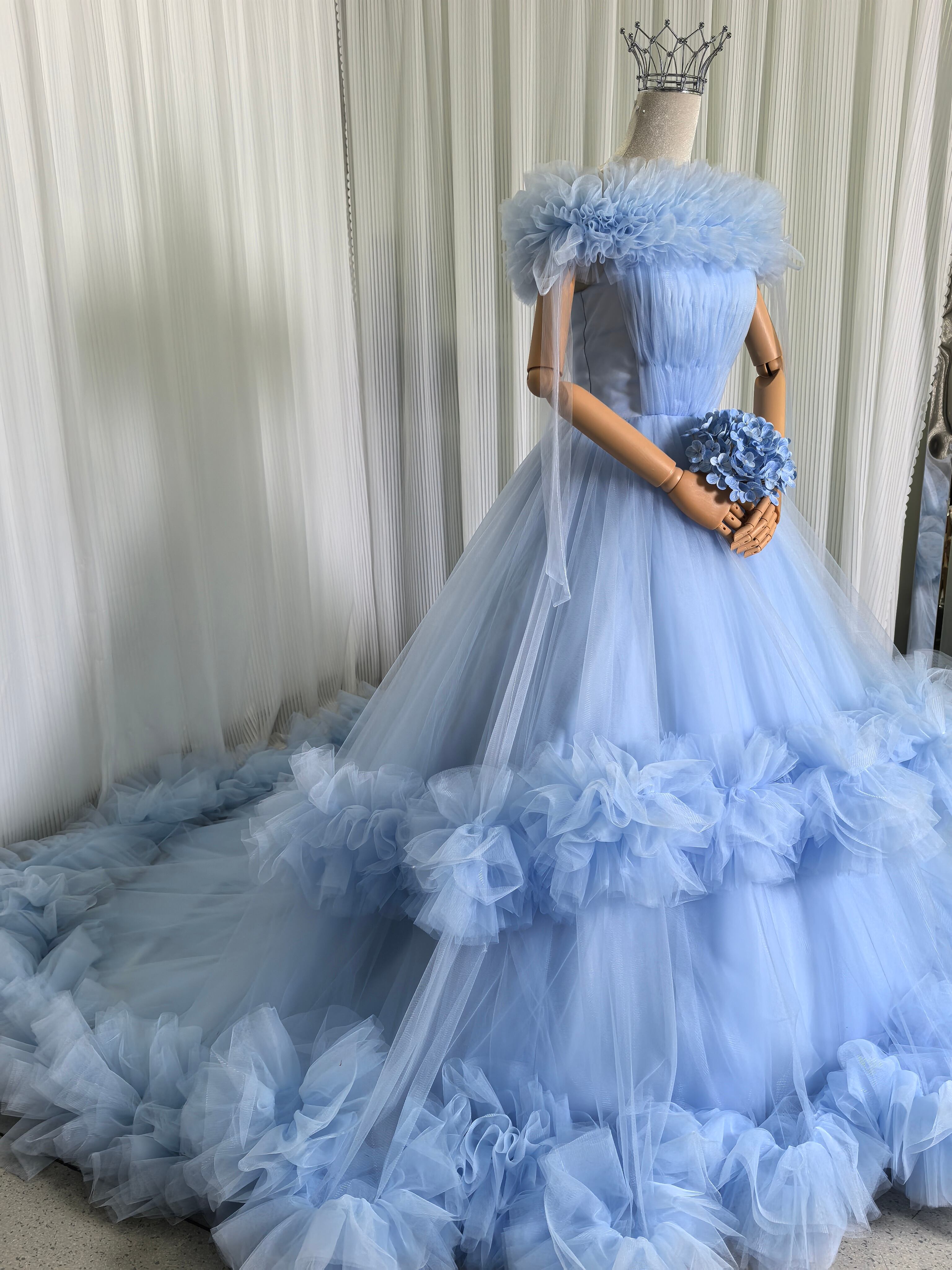 カラードレス 爽やかで優しいブルー フリルトレーン 編み上げ 取り外し可能なオフショルダー ソフトチュール ボリュームドレス 結婚式