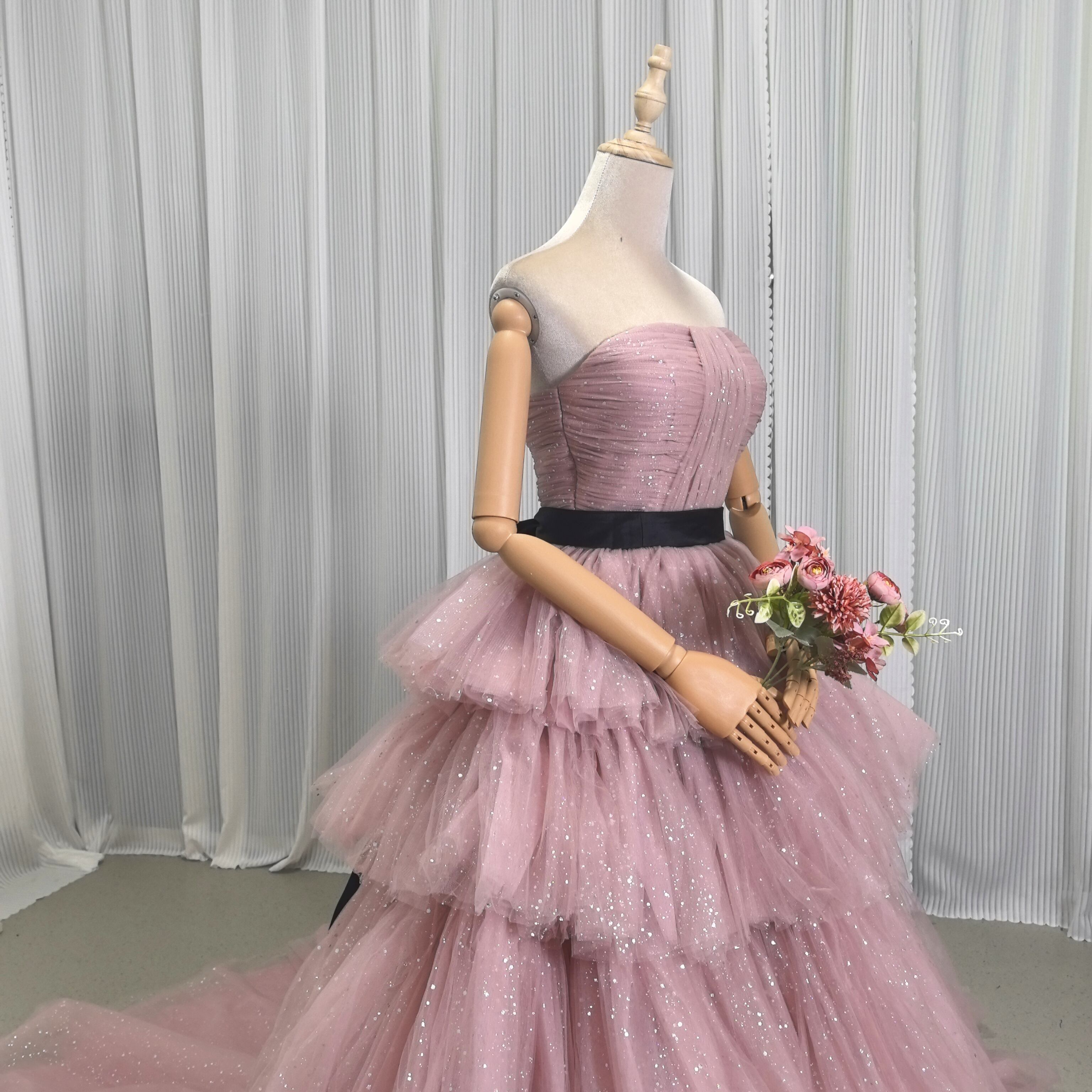 カラードレス くすみピンク ベアトップ キラキラグリッターチュール スリット サッシュベルト ティアードのドレス 結婚式