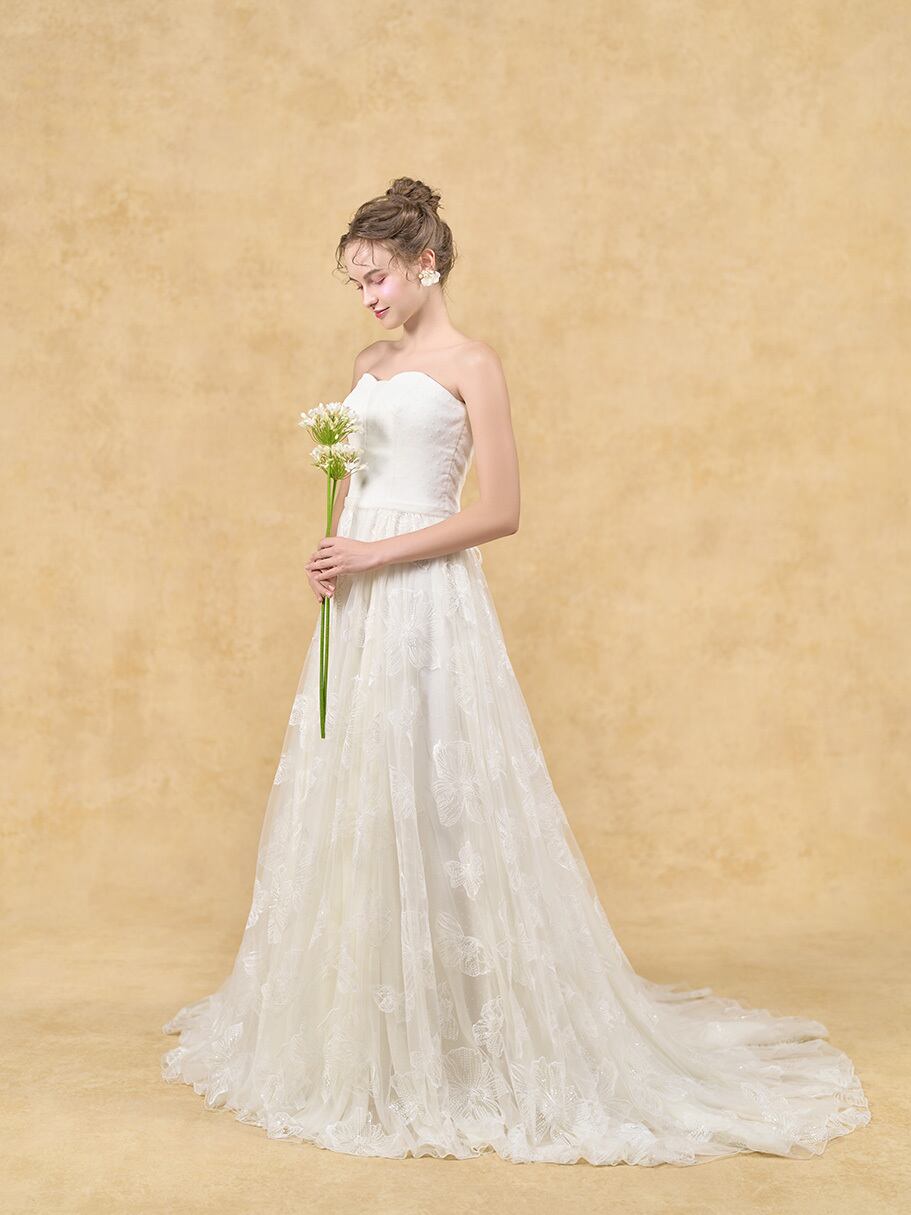 ウエディングドレス オフホワイト ビスチェドレス 花柄モチーフで刺繍が美しい スレンダーライン 結婚式 前撮り
