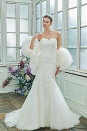 ウエディングドレス オフホワイト キラキラ光る刺繍 ベアトップ マーメイドライン ケープ風ドレス 結婚式