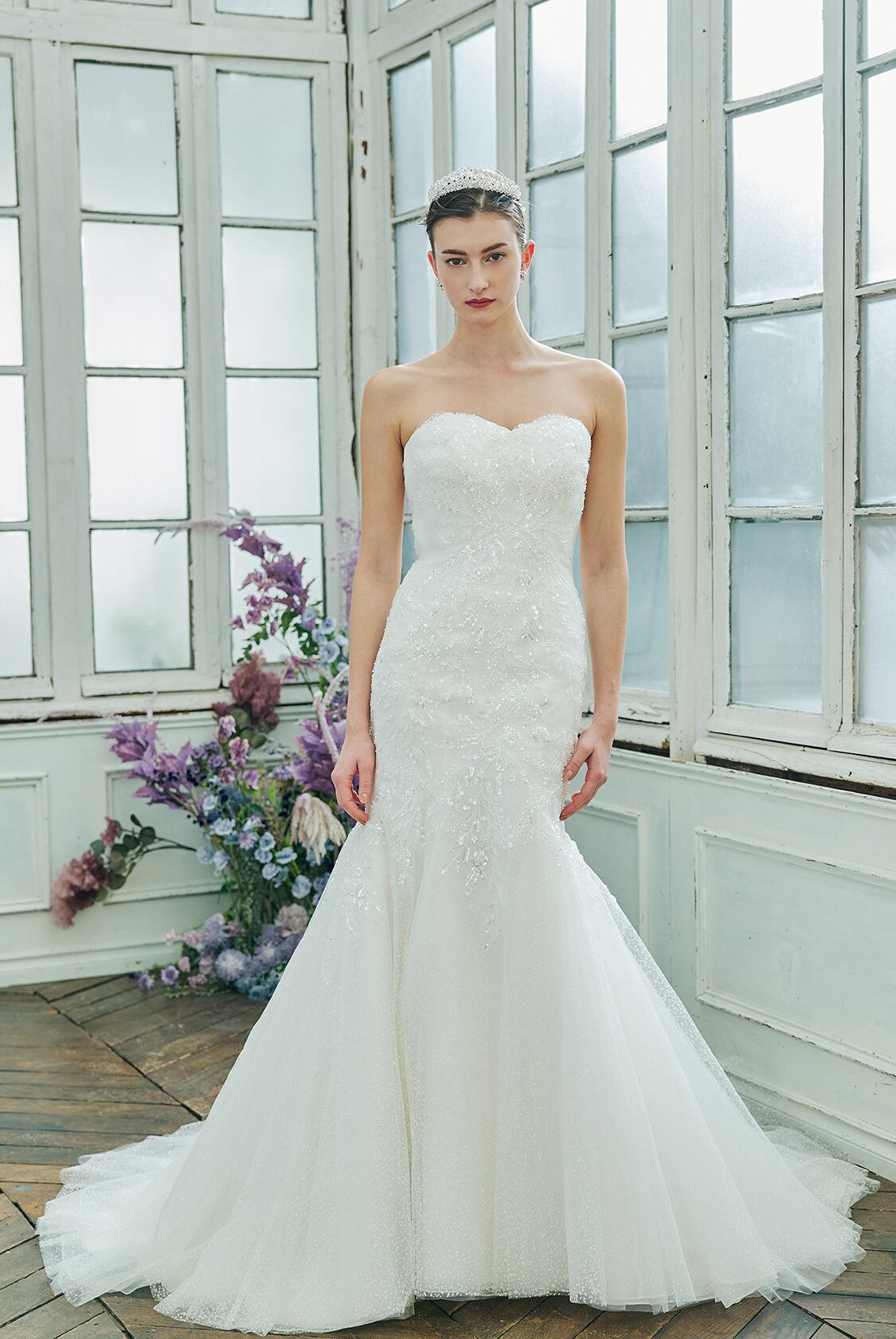 ウエディングドレス オフホワイト キラキラ光る刺繍 ベアトップ マーメイドライン 結婚式