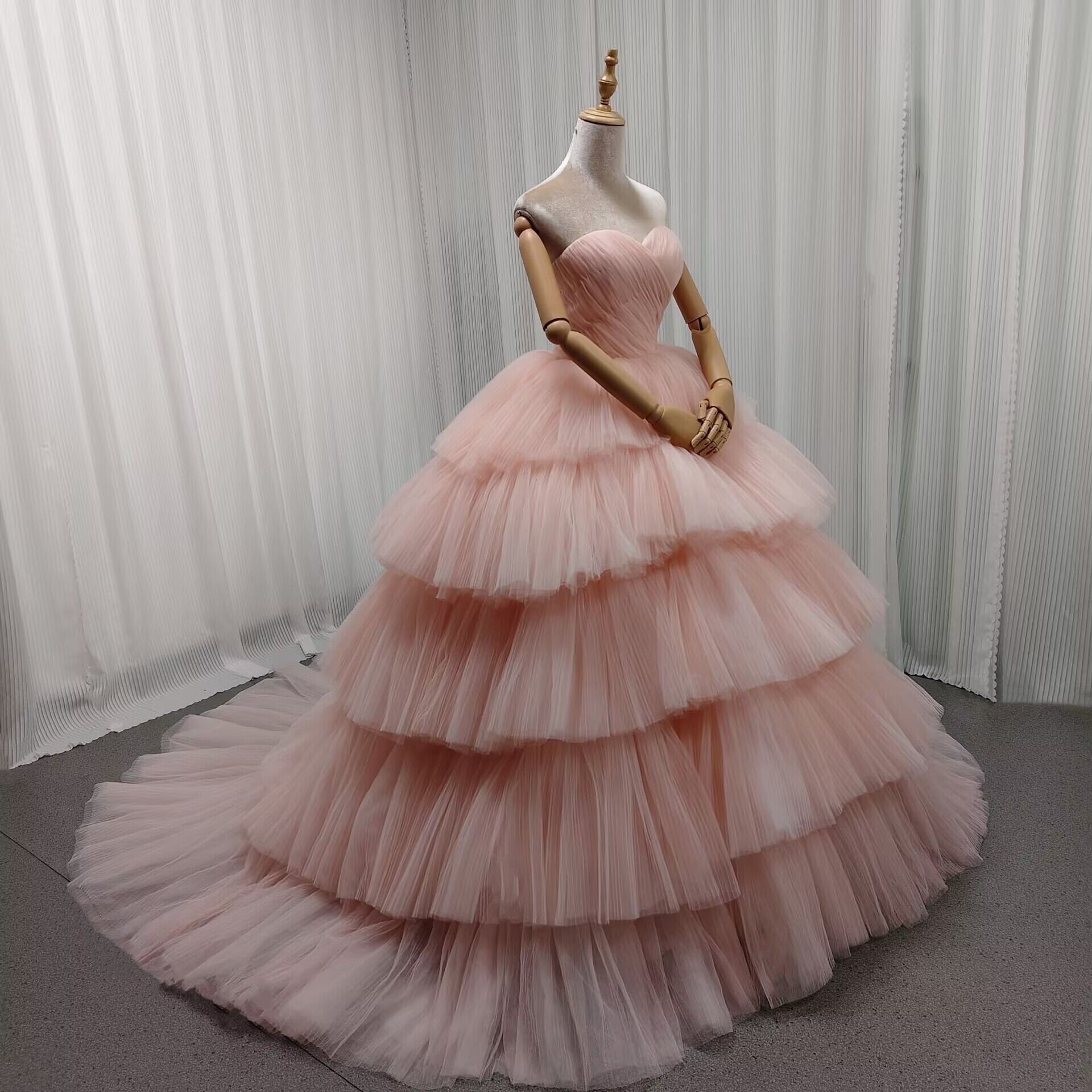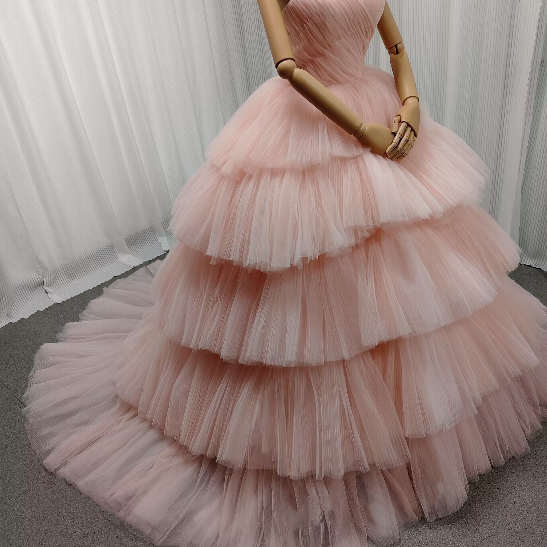 カラードレス ピンク 取り外し可能なオフショルダー 柔らかく重ねたチュールスカート 可愛い 編み上げ ティアードのドレス 花嫁