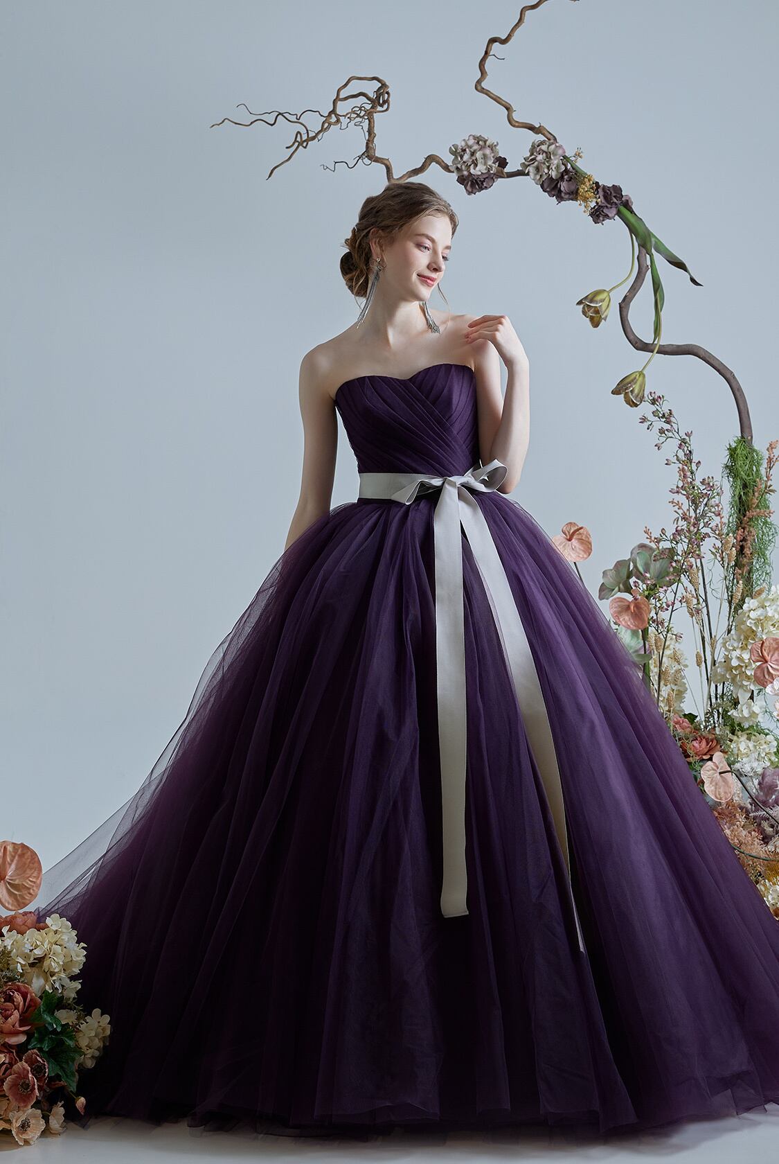 カラードレス パープル 取り外し可能な付け袖 サッシュベルト 柔らかく重ねたチュールスカート ビスチェドレス 花嫁 前撮り
