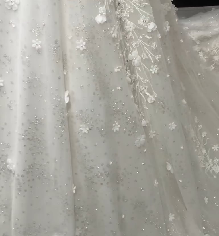 ウエディングドレス オフホワイト 韓国風ドレス 短袖 ラウンドネック キラキラグリッターチュール 3D立体レース刺繍 披露宴/結婚式
