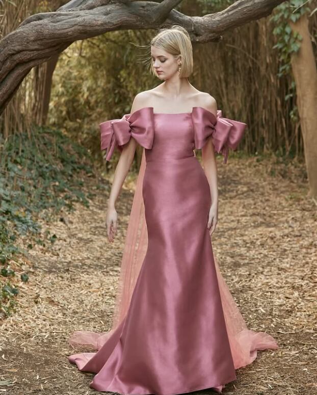 カラードレス くすみピンク リボン風オフショルダー 光沢サテン ソフトマーメイドライン トレーン ソフトチュール 花嫁 前撮り