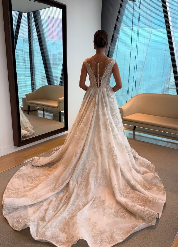 ウエディングドレス オフホワイト 花柄モチーフで刺繍が美しい セクシー くるみボタン 華やかなトレーン 結婚式