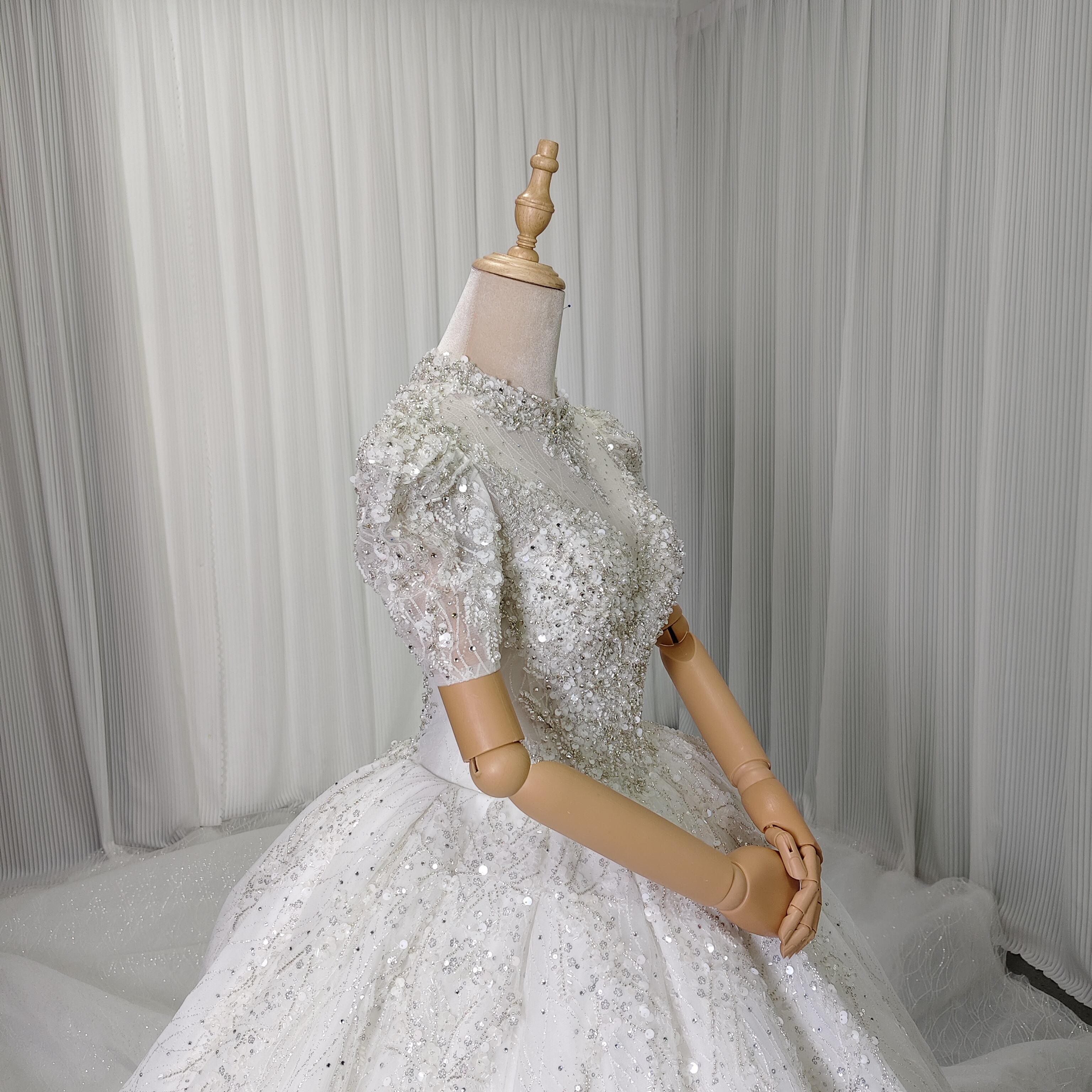 ウエディングドレス オフホワイト 韓国風ドレス 短袖 キラキラのハンドビーディング キラキラグリッターチュール 華やかなトレーン 憧れのドレス 結婚式