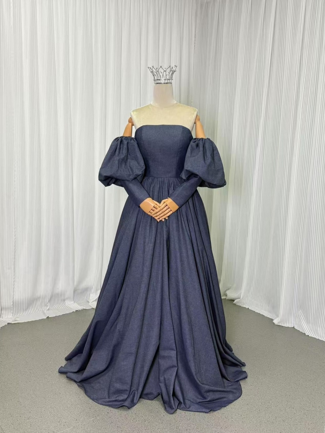 カラードレス ブルー ロングスリーブ 編み上げ 短トレーン デニムドレス 花嫁 前撮り