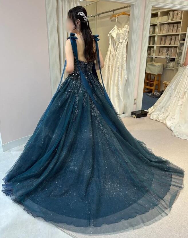 カラードレス 深緑 リボン キャミソール キラキラグリッターチュール 編み上げ ピアノ演奏会/音楽会