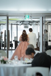 実例写真!カラードレス ピンク オフショルダー 編み上げ 華やかなトレーン プリンセスライン 結婚式