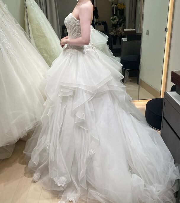ウエディングドレス ベアトップ 繊細レース 編み上げ ソフトチュール 華やかなトレーン ホワイト 結婚式 前撮り