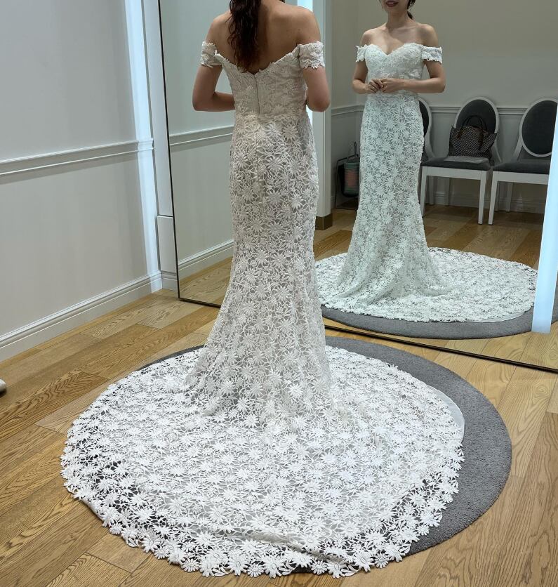 ウエディングドレス オフホワイト オフショルダー 贅沢な総レース ソフトマーメイドライン 細見えシルエット 結婚式 前撮り