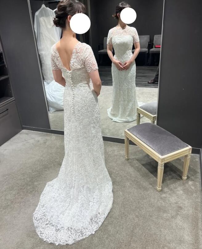 ウエディングドレス オフホワイト ラウンドネック 短袖 贅沢な総レース 細見えシルエット ソフトマーメイドライン 結婚式 前撮り