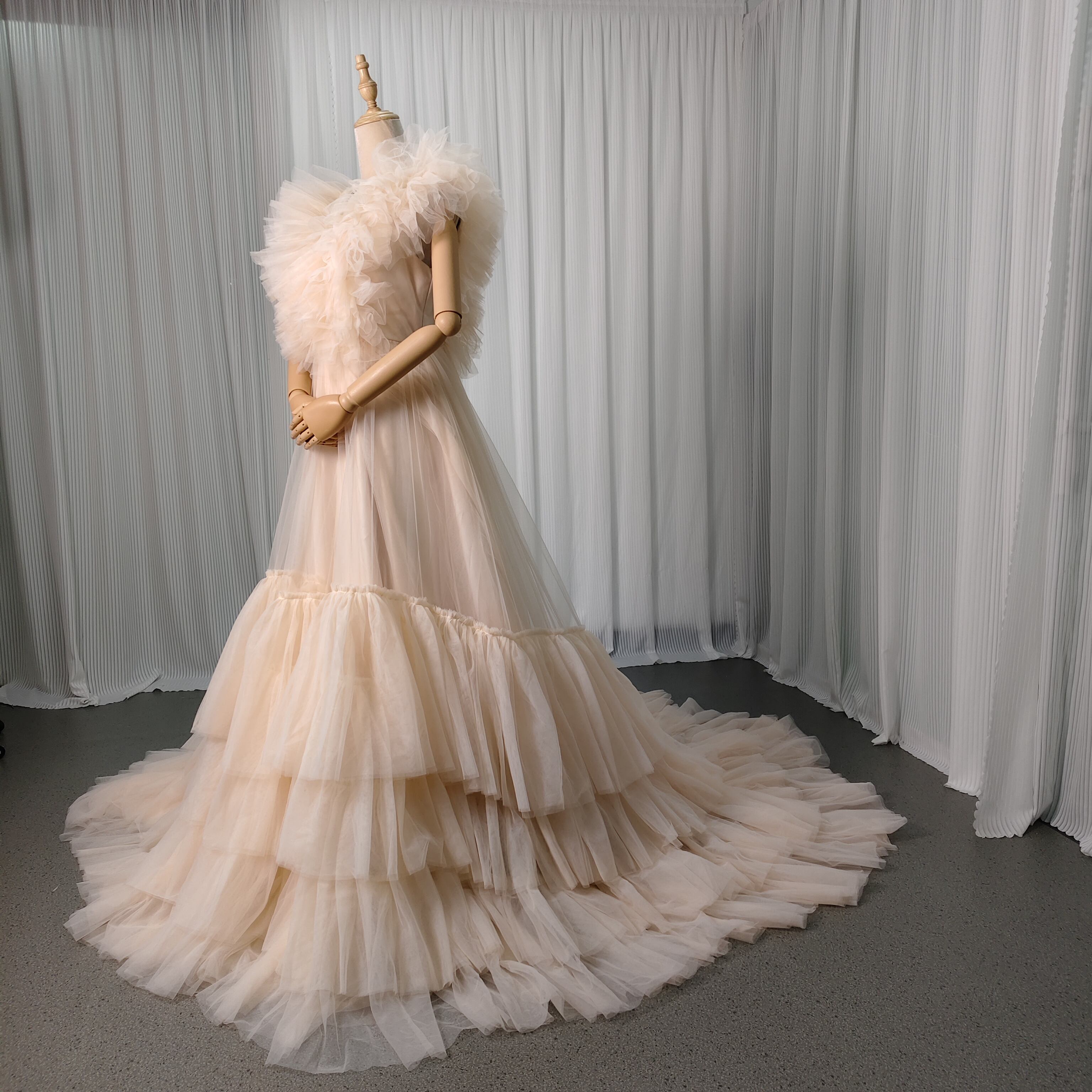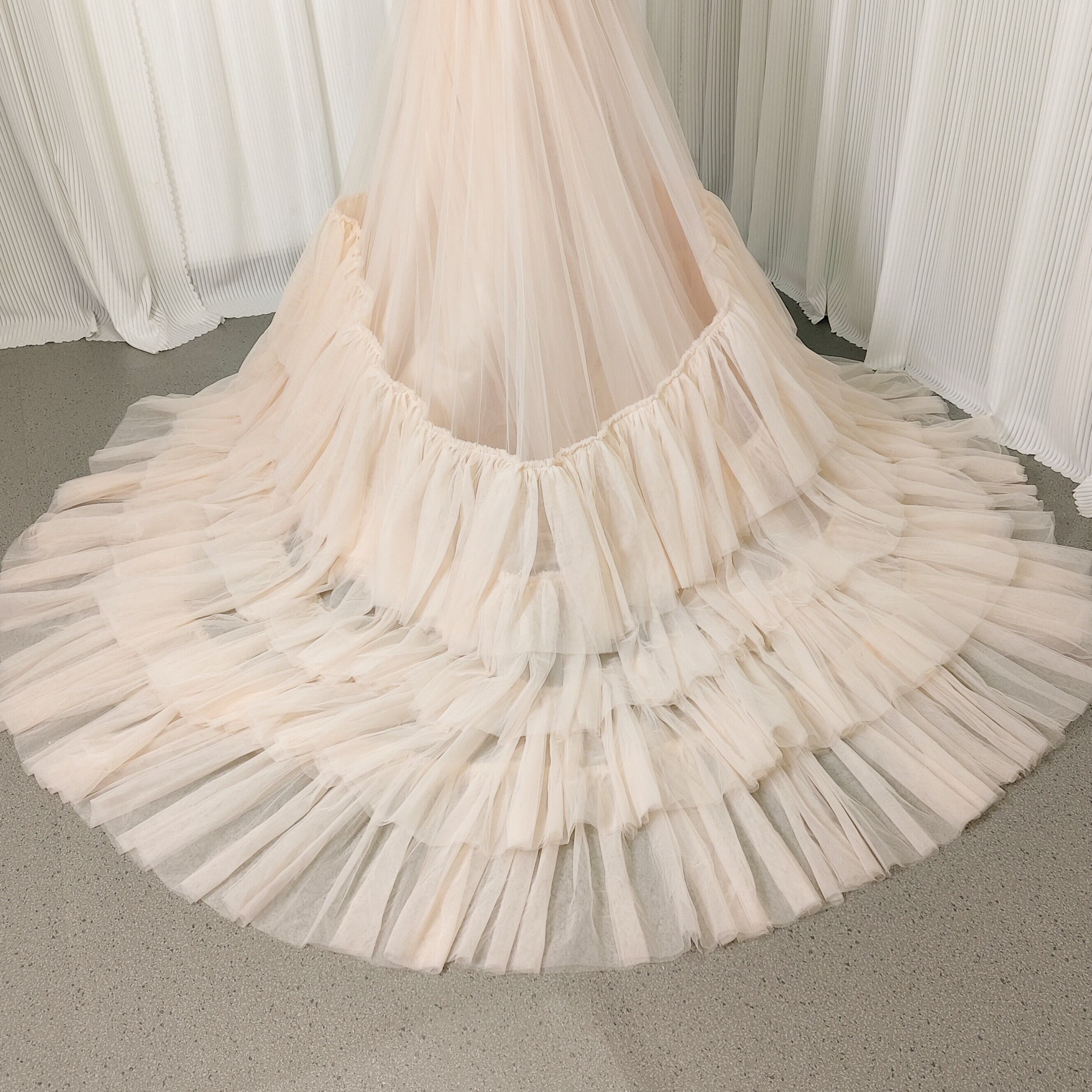 カラードレス シャンパン色 ソフトチュール Vネック ロングトレーン 花嫁 前撮り