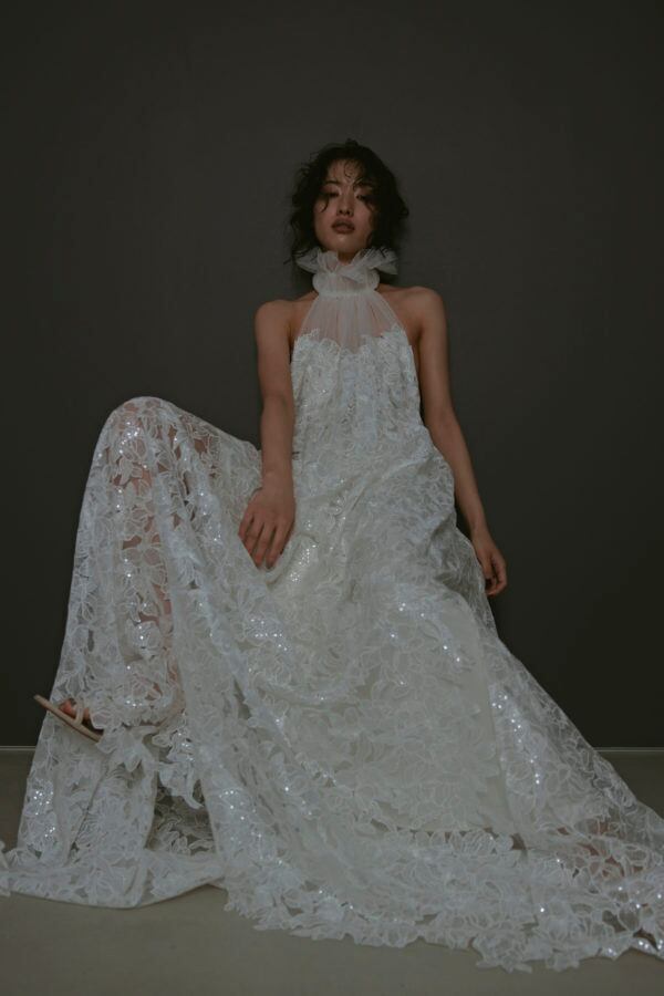 ウエディングドレス オフホワイト 贅沢な総レース ホルターネック バックレス 華やかなトレーン 花嫁 前撮り