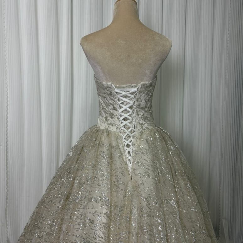 ウエディングドレス オフホワイト ベアトップ キラキラグリッターチュール 華やかなトレーン 編み上げ 結婚式