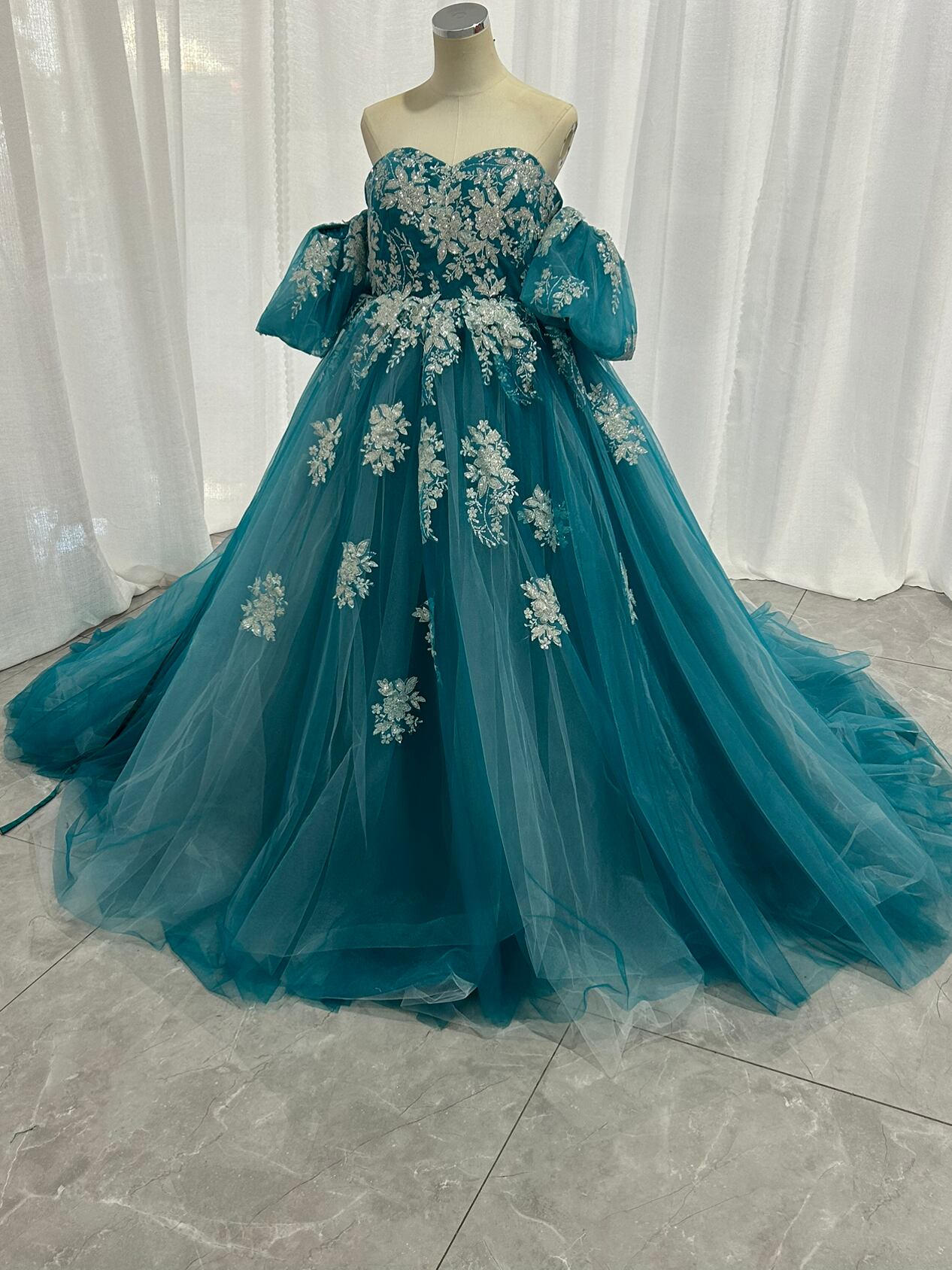 カラードレス ブルー フレア袖 キラキラ光る刺繍 グラデーションドレス 華やかなトレーン 花嫁 前撮り