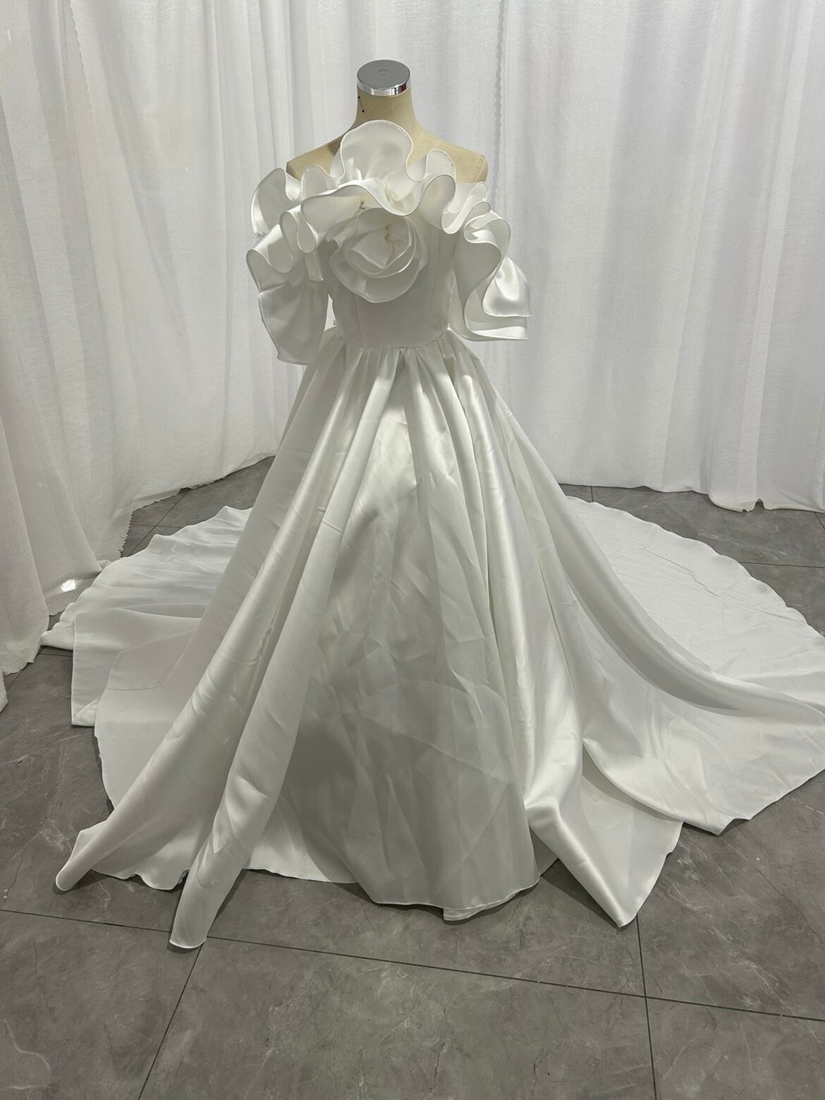 ウエディングドレス オフホワイト フリルオフショルダー ミカドサテン 華やかなトレーン 結婚式
