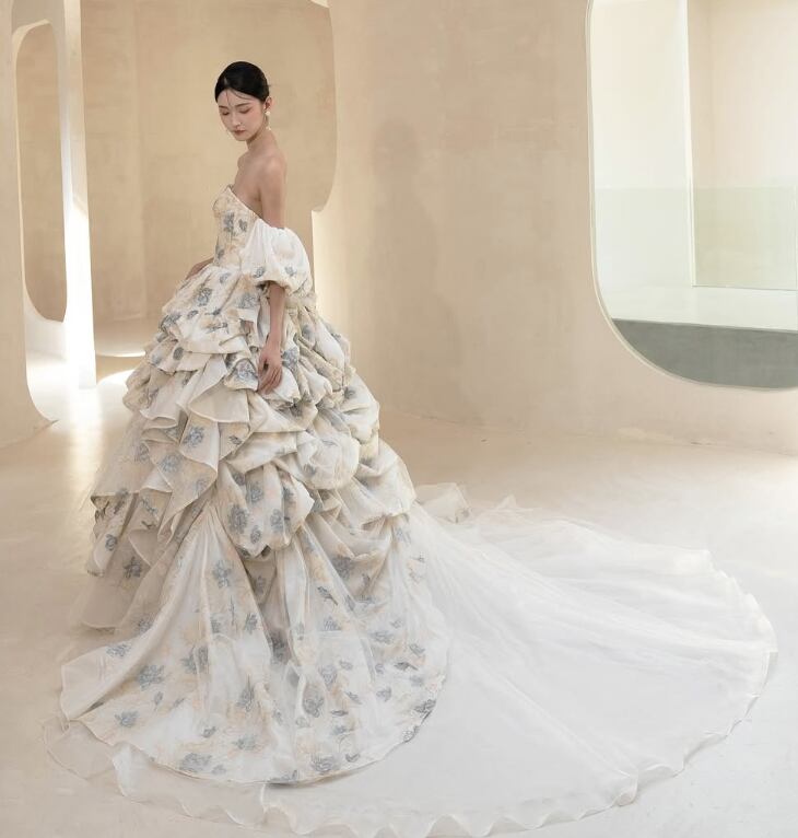 カラードレス オフホワイト プリント模様 フレア袖 華やかなトレーン アシンメトリードレス 結婚式 前撮り