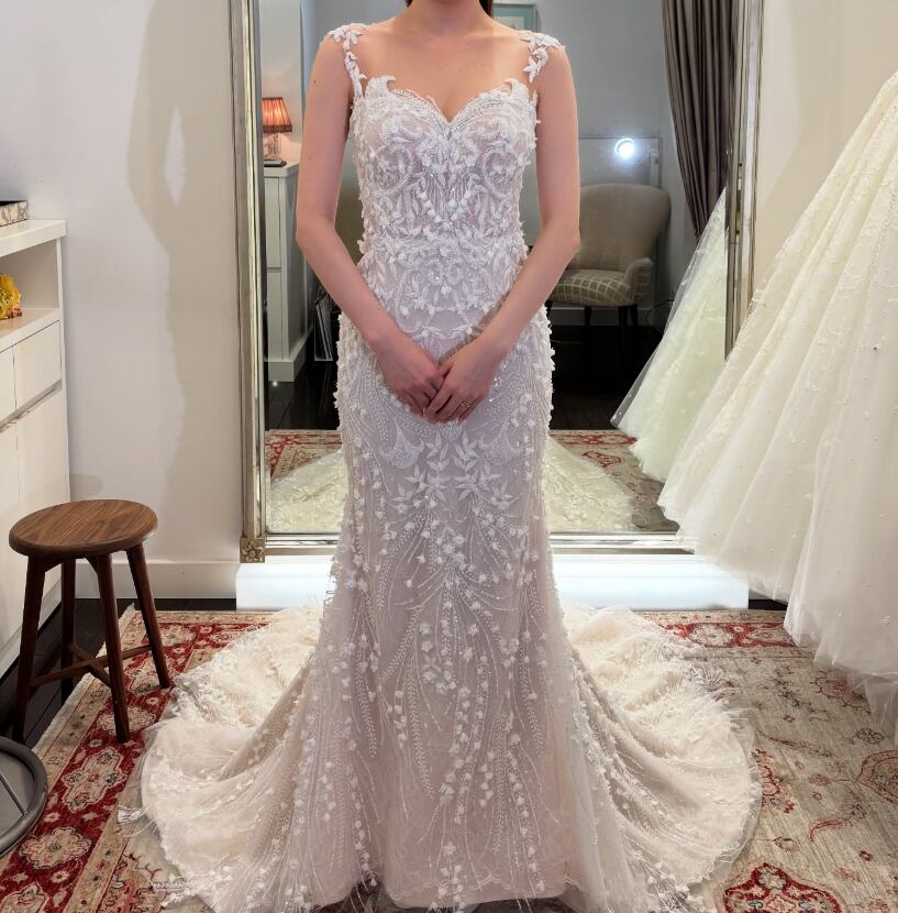 ウエディングドレス オフホワイト 贅沢な総レース 細見えシルエット キャミソール ソフトマーメイドライン 華やかなトレーン 結婚式 前撮り