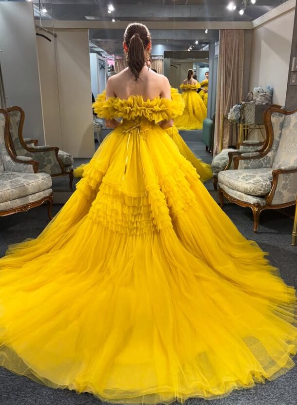 カラードレス 鬱金色 オフショルダー ソフトチュール ボリュームドレス 華やかなトレーン 結婚式