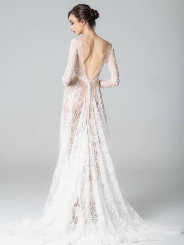 ウエディングドレス オフホワイト ロングスリーブ バックレス 贅沢な総レース オーバードレス 結婚式 前撮り