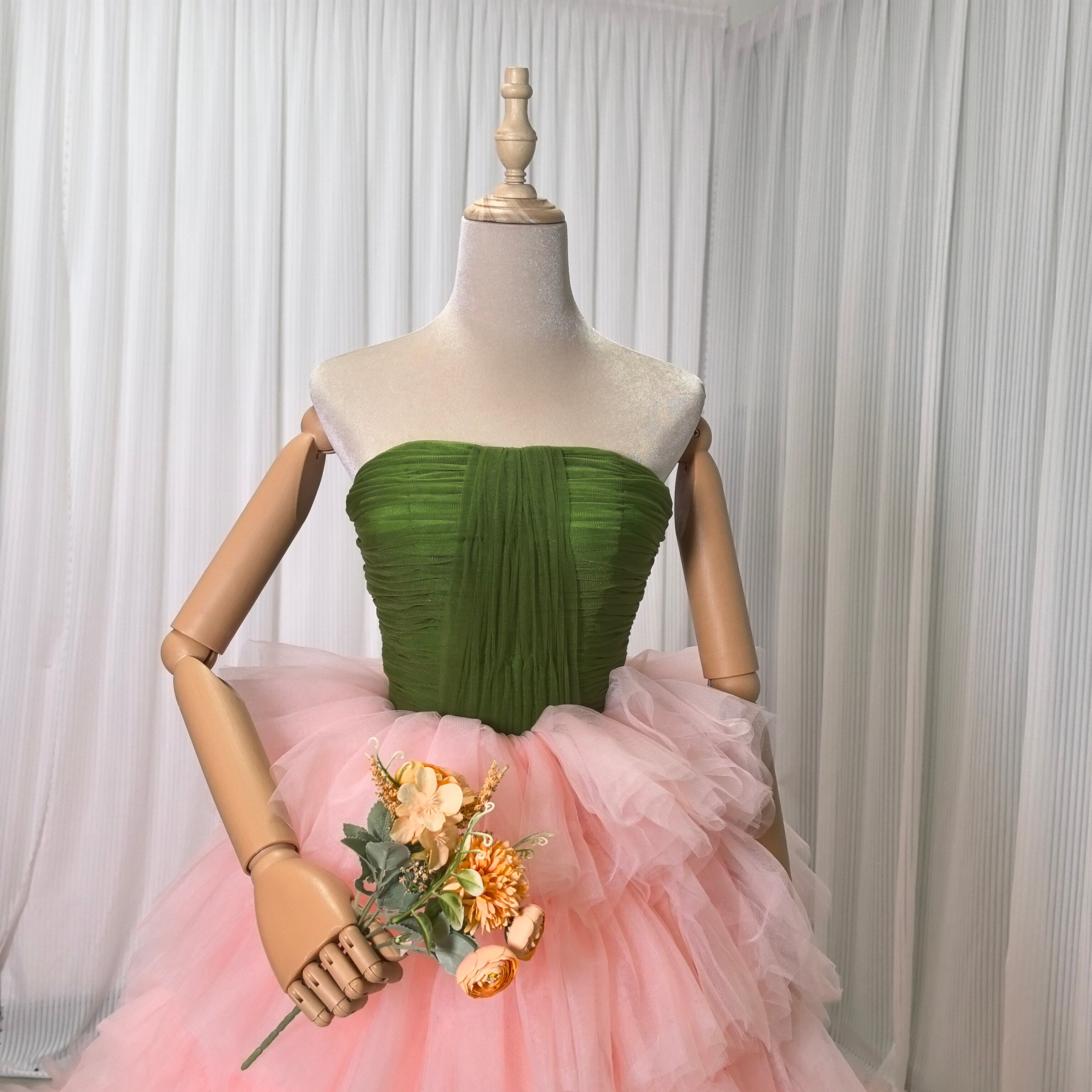 カラードレス グリーン ピンク ベアトップ 編み上げ 柔らかく重ねたチュールスカート 華やかなトレーン 花嫁