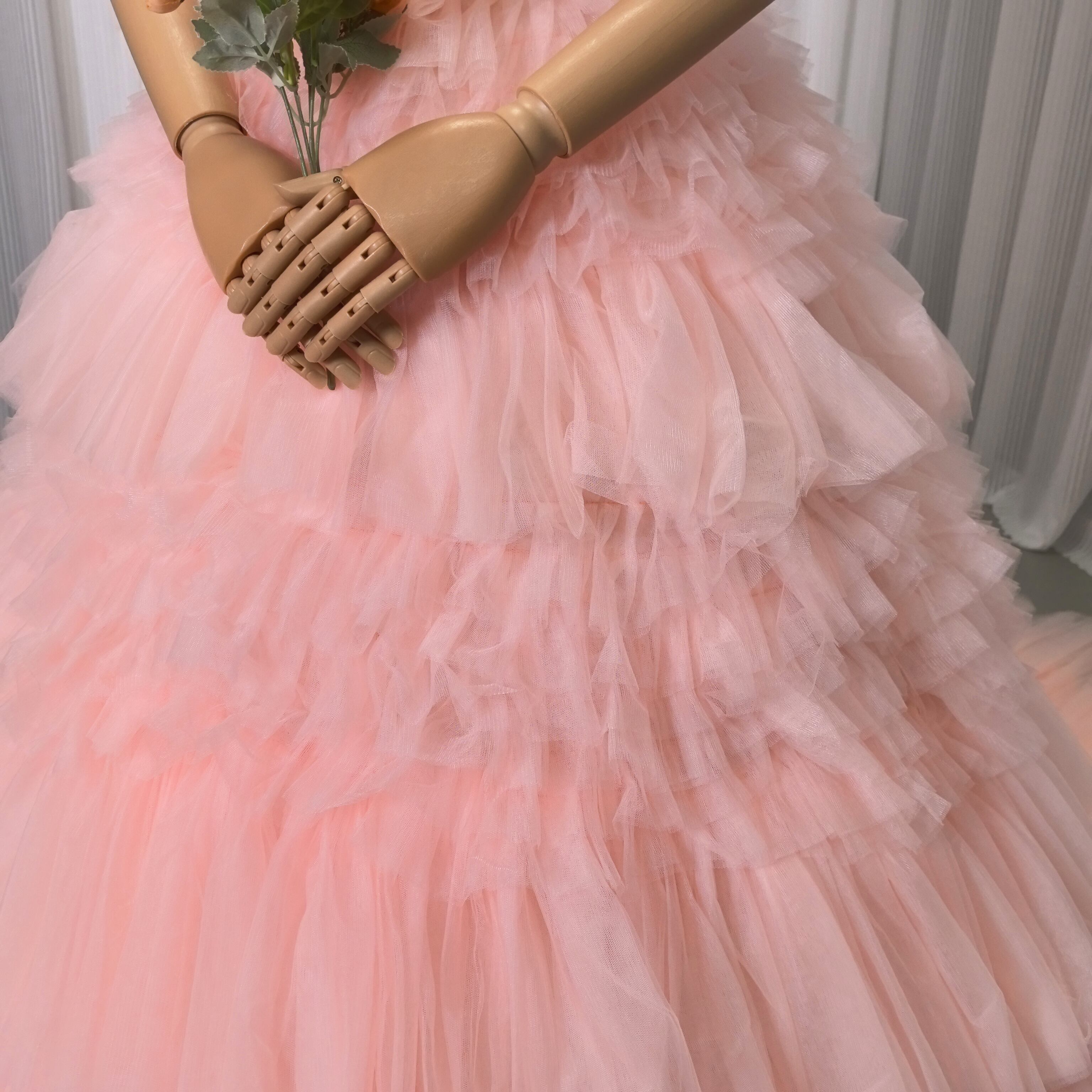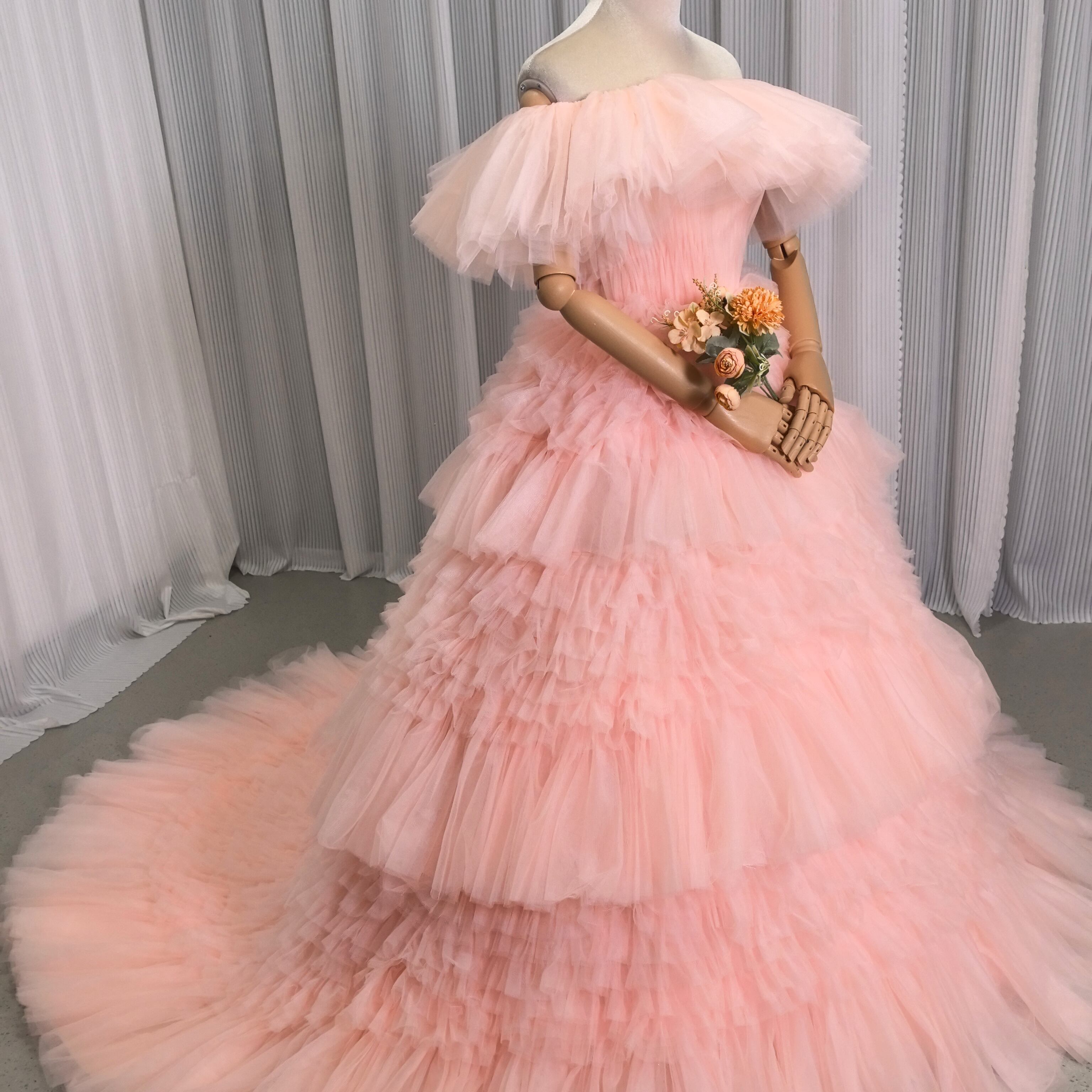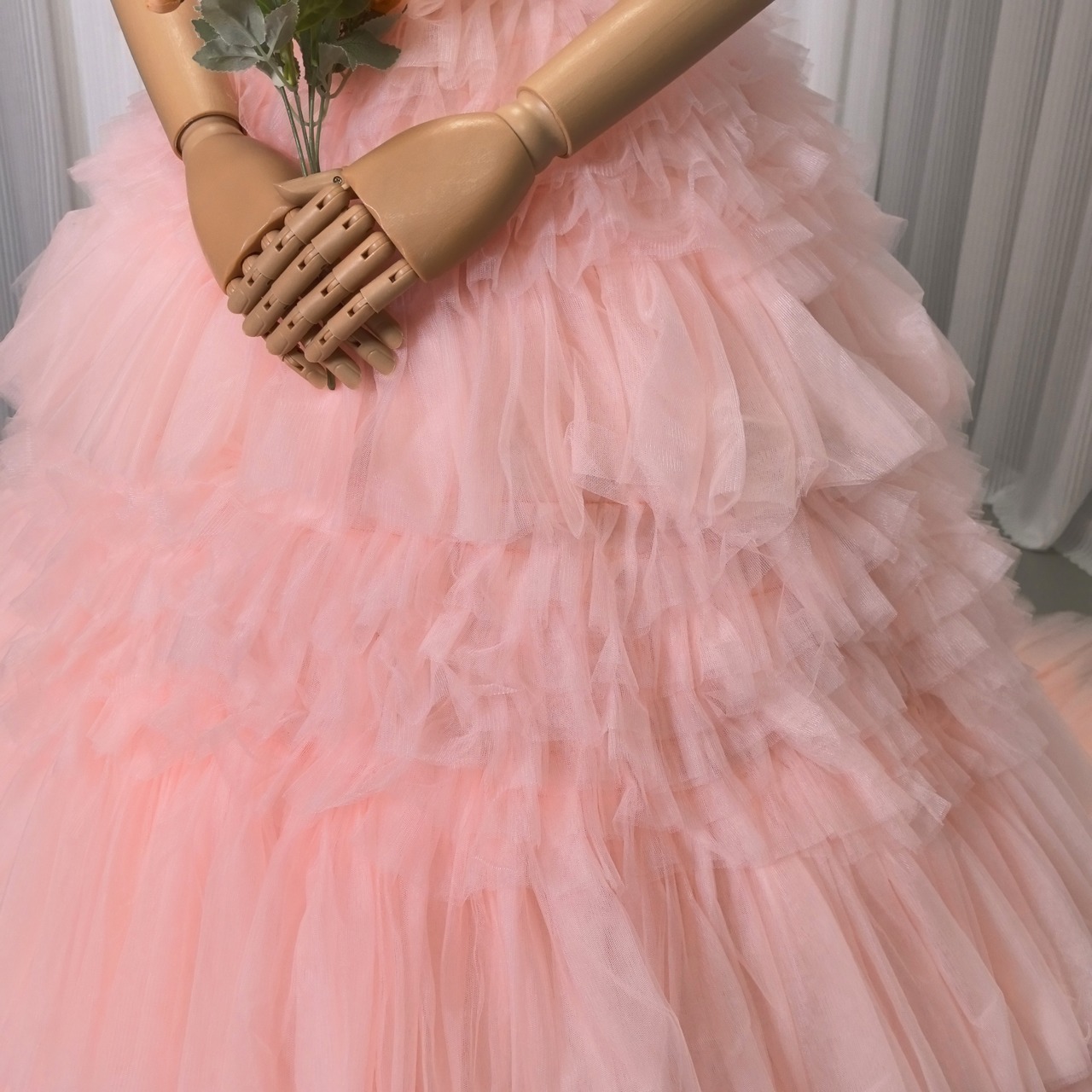 カラードレス ピンク 取り外し可能なオフショルダー 編み上げ 華やかなトレーン もこもこドレス 柔らかく重ねたチュールスカート 結婚式