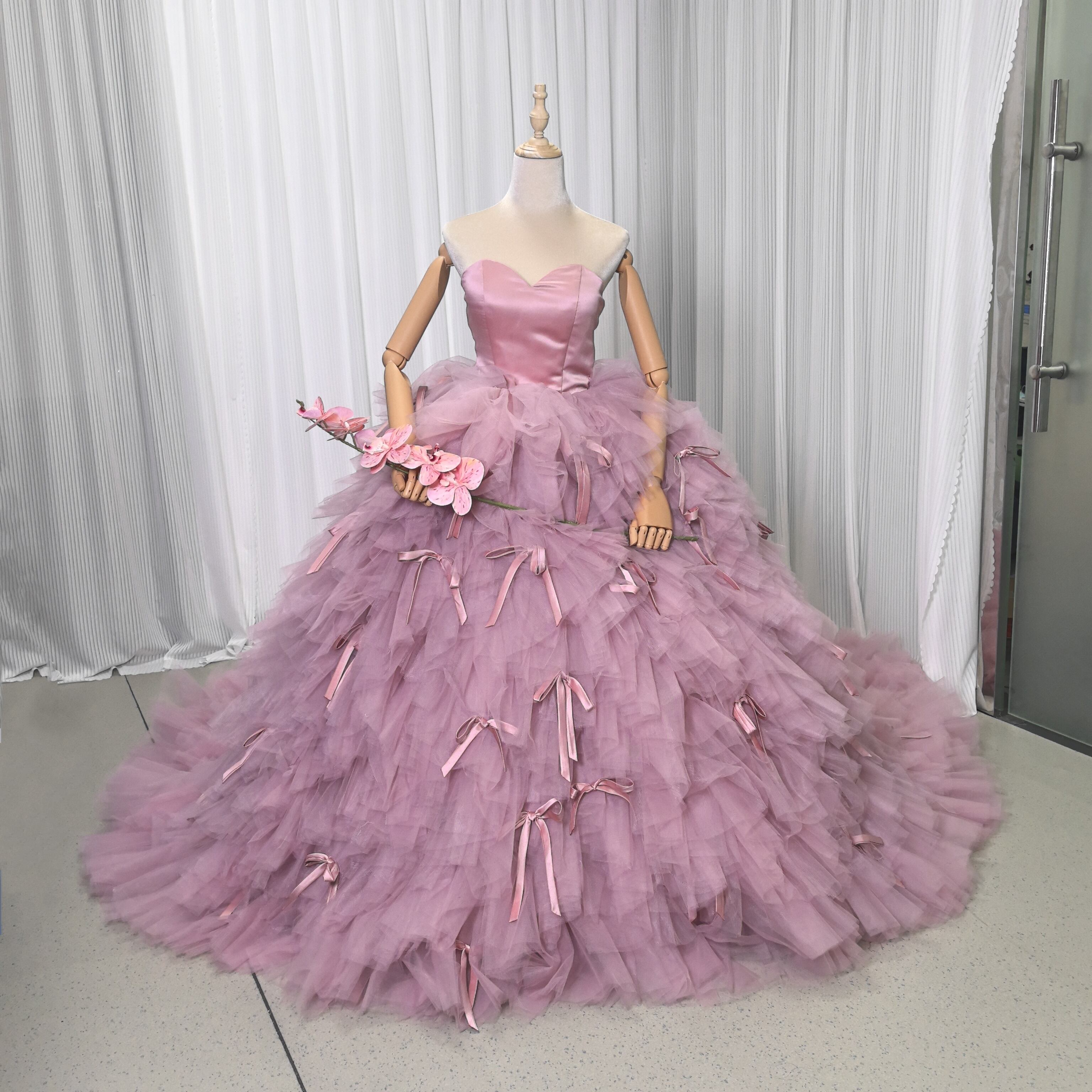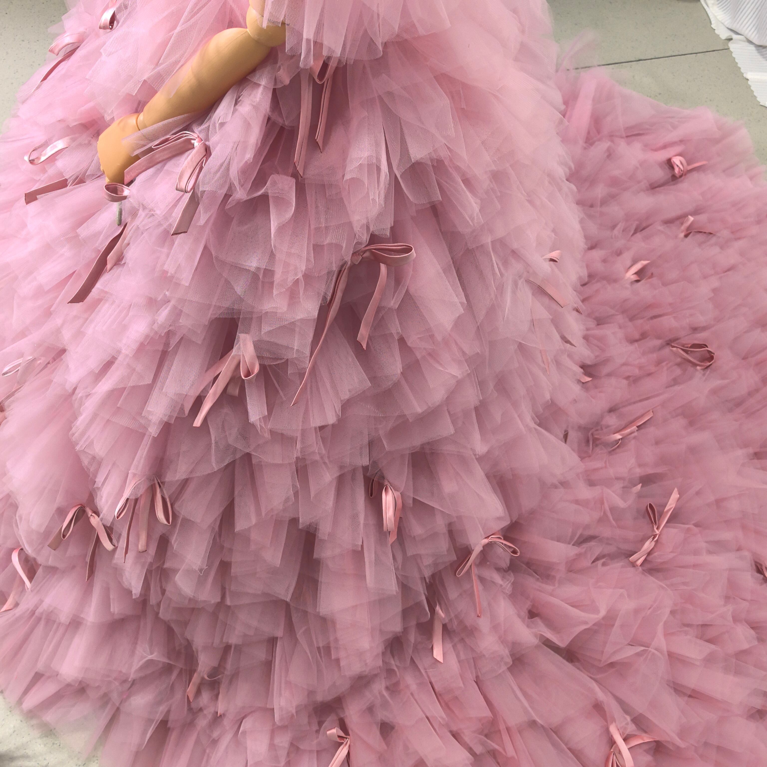 カラードレス ピンク 取り外し可能な付け袖 リボン もこもこドレス 華やかなトレーン フレアスカート 結婚式