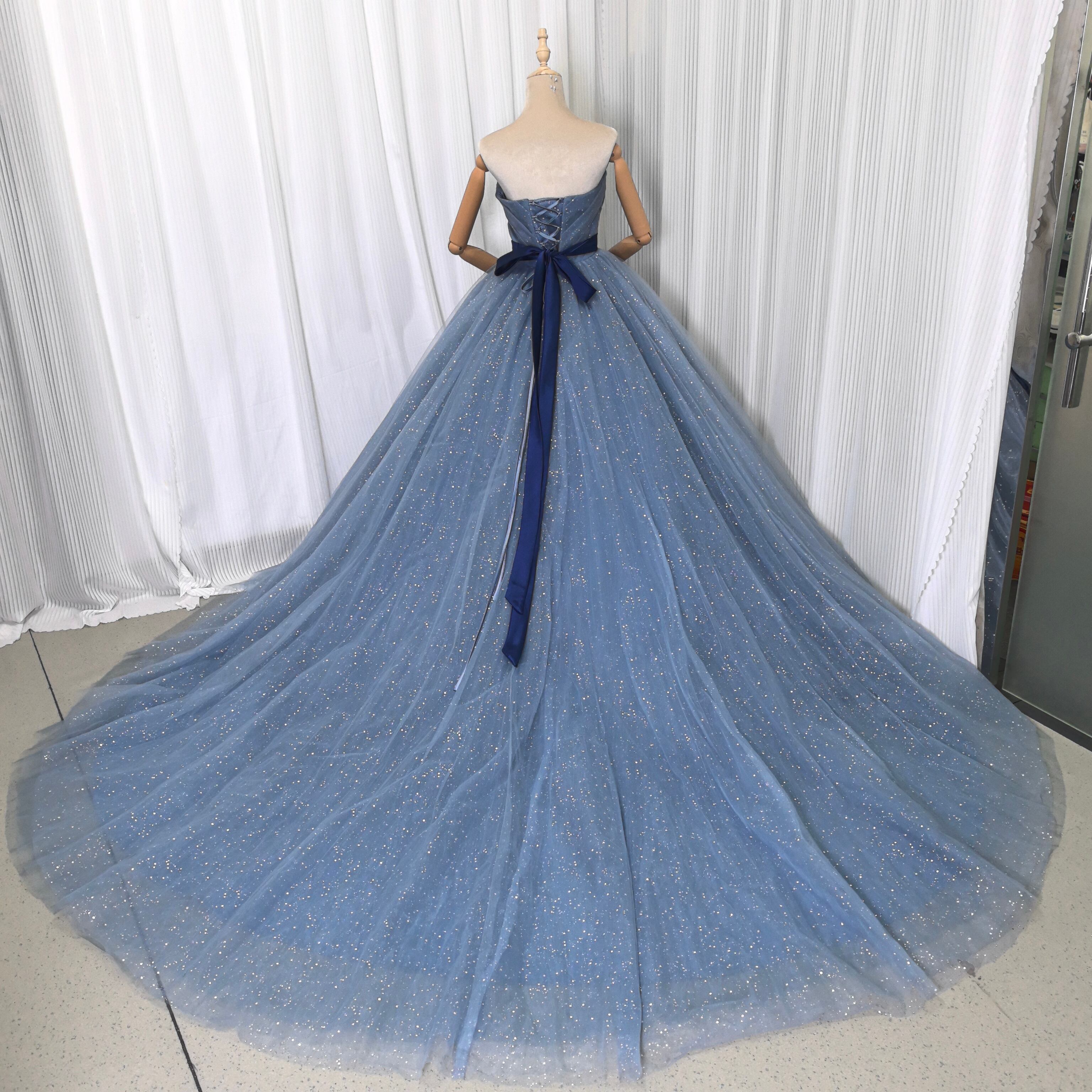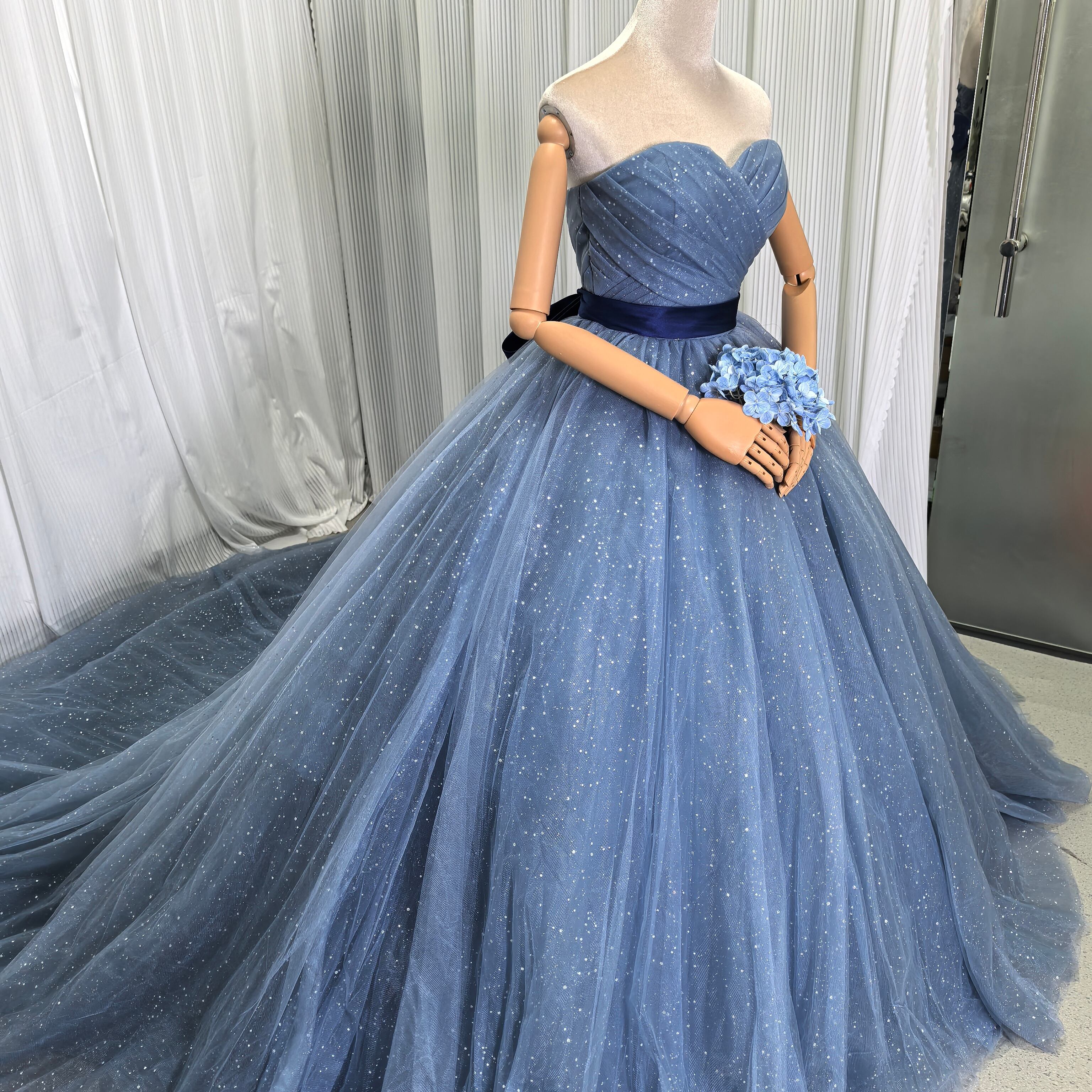 カラードレス ブルー ベアトップ 編み上げ キラキラグリッターチュール サッシュベルト ロングトレーン 結婚式