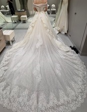 ウエディングドレス オフホワイト オフショルダー 韓国風ドレス 繊細なレース 華やかなトレーン 結婚式