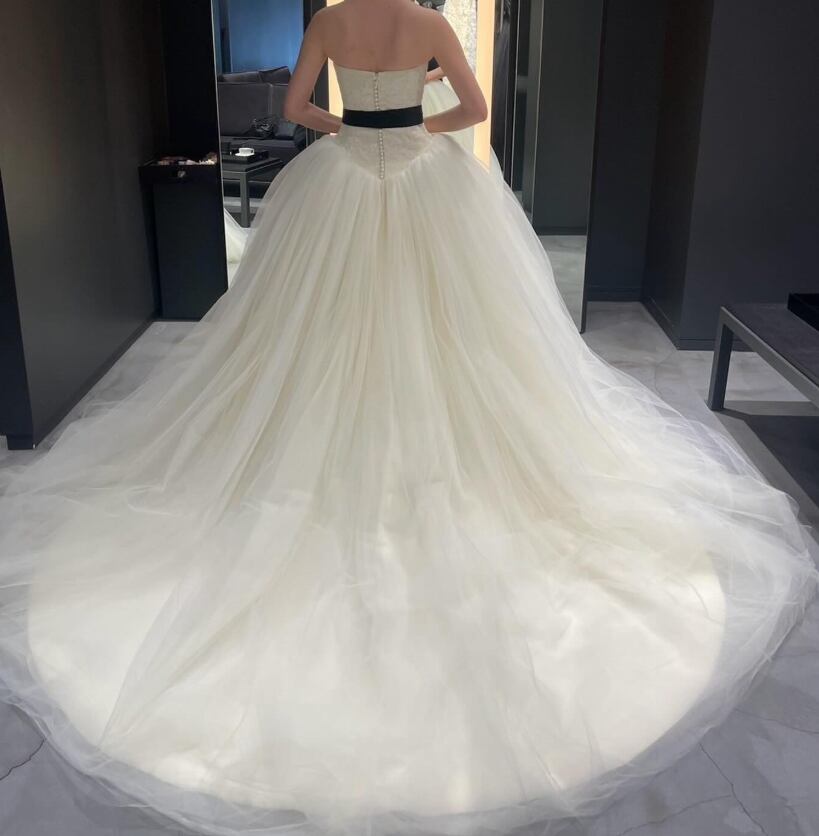 ウエディングドレス ベアトップ くるみボタン サッシュベルト オフホワイト ソフトチュール 華やかなトレーン 披露宴/結婚式