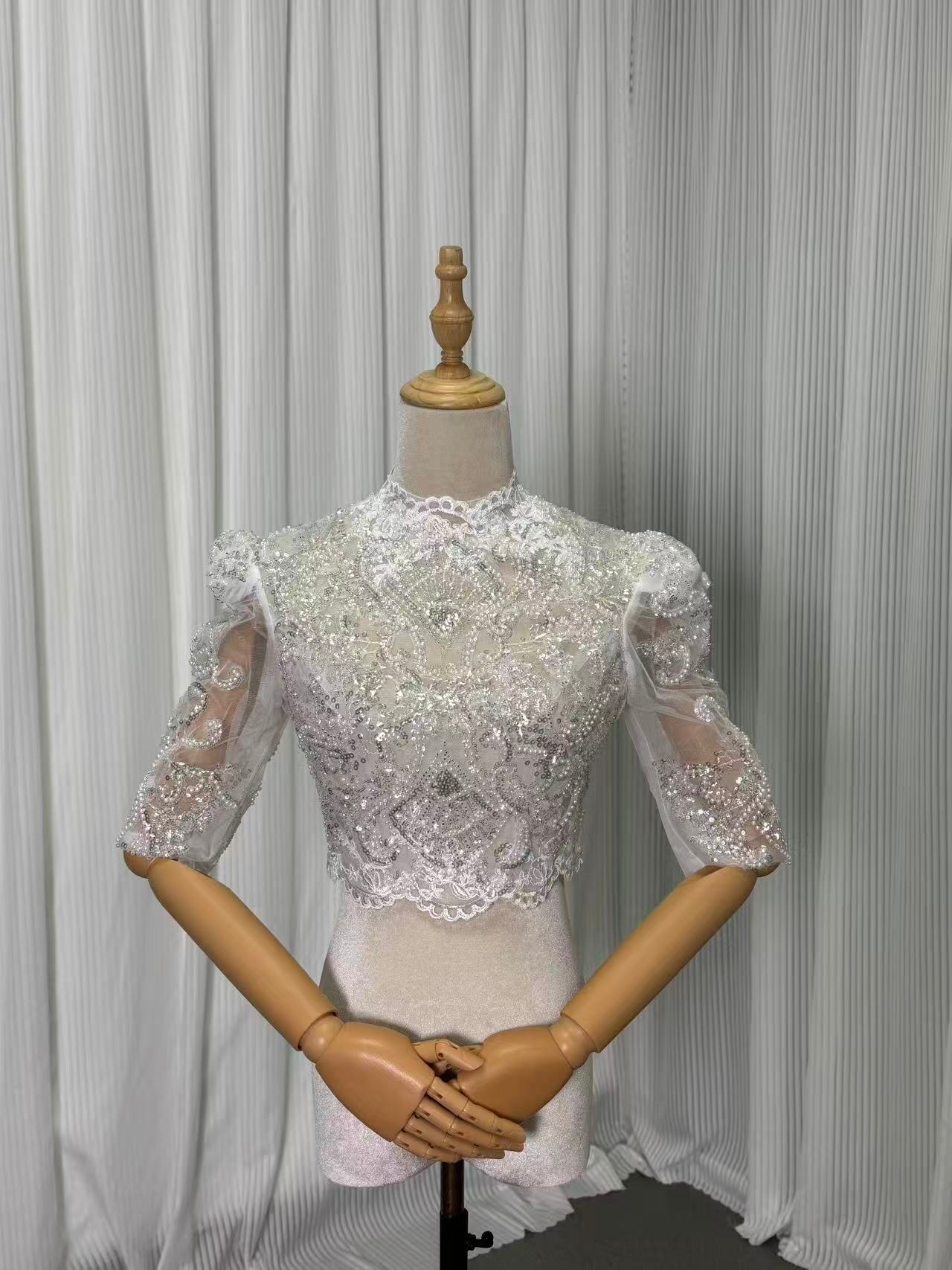 送料無料! オフホワイト 繊細なレース ハイネック 七分袖丈 ボレロ 結婚式 前撮り