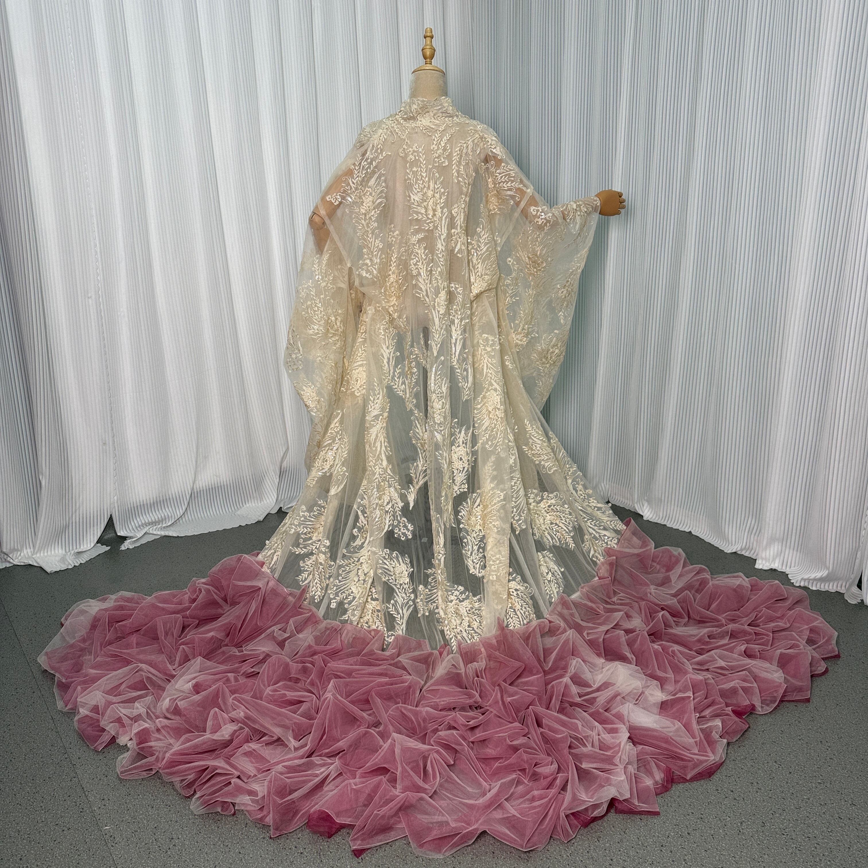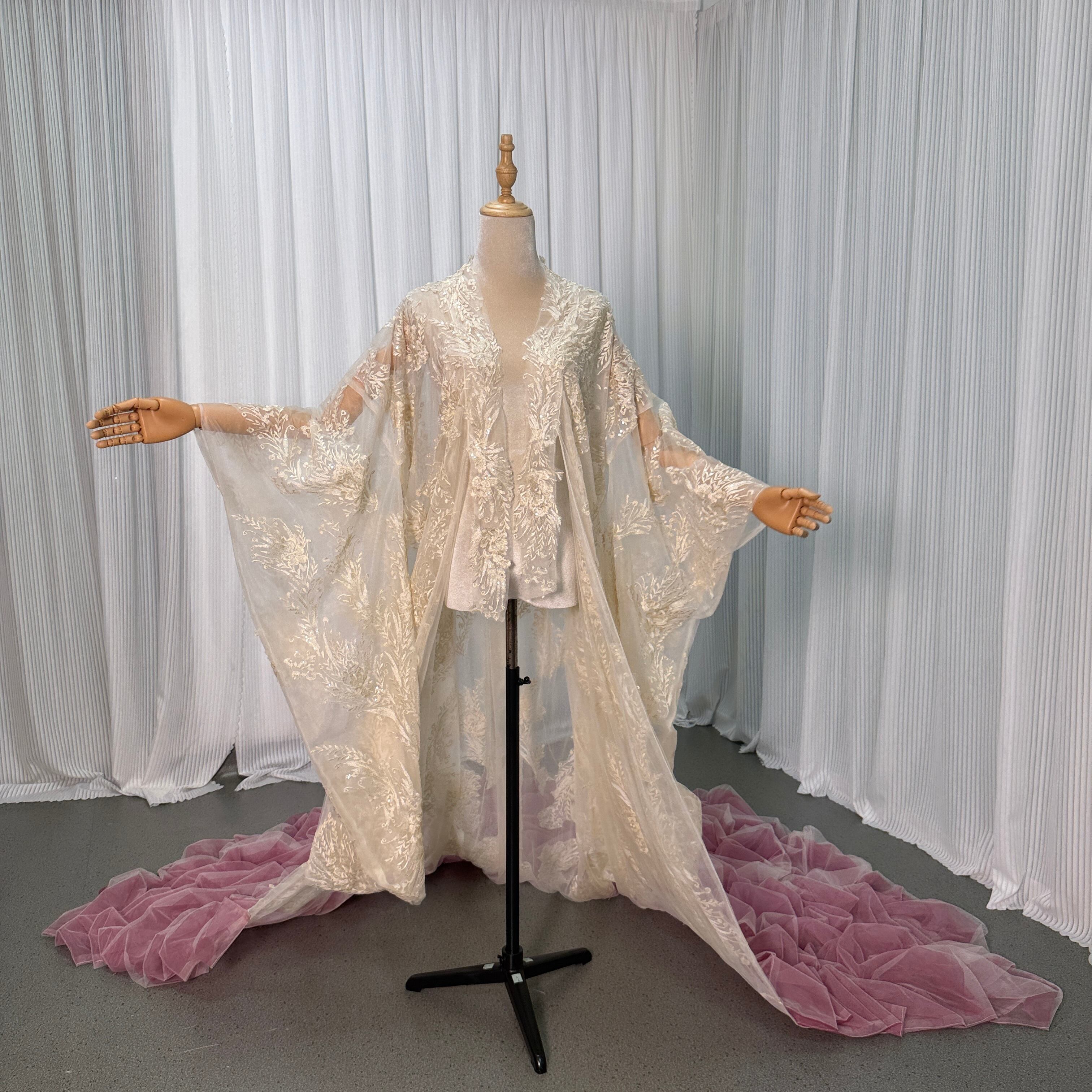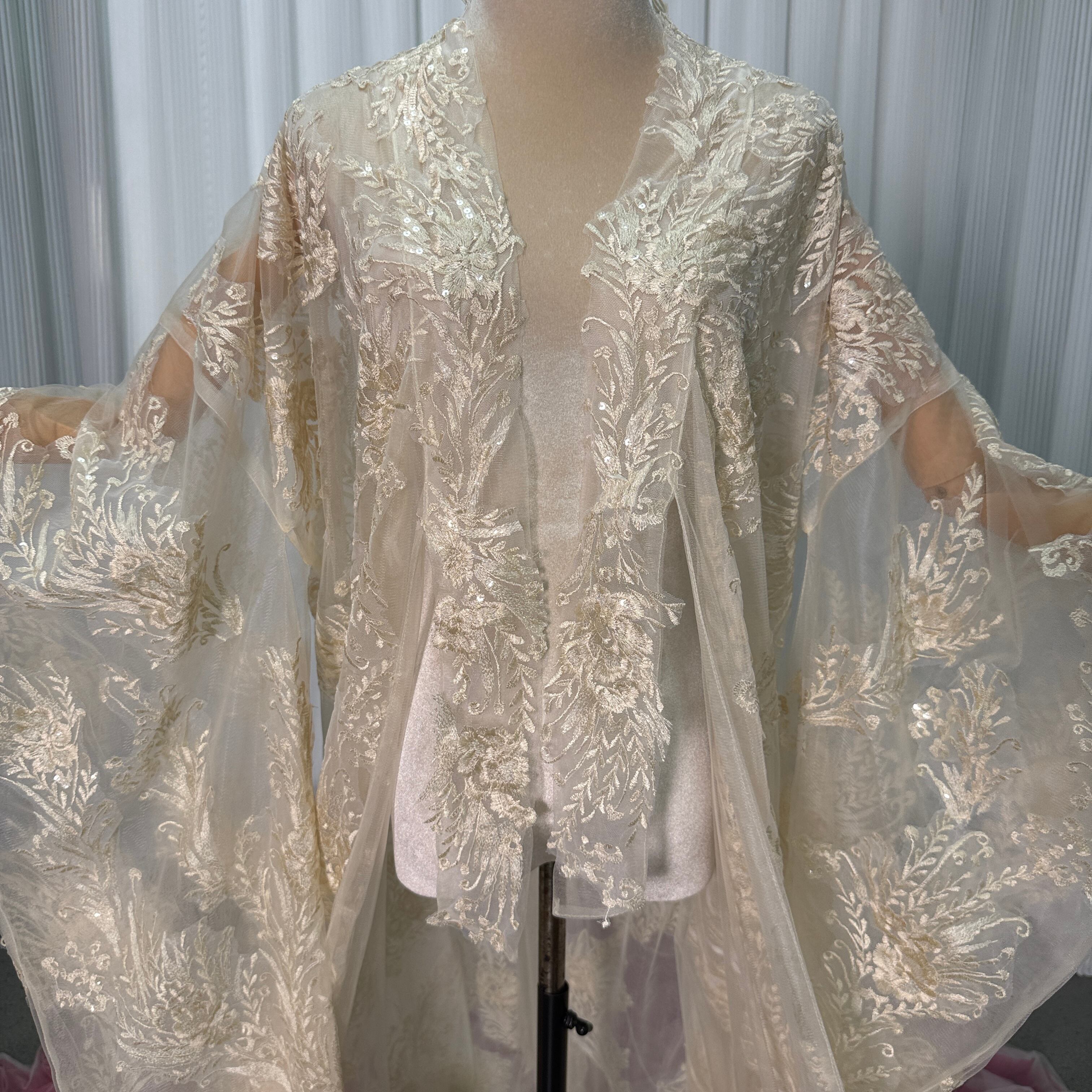 打掛 着物 薄シャンパンの色 華やかなトレーン オーバードレス レース羽織 お色直し 精緻な刺繍