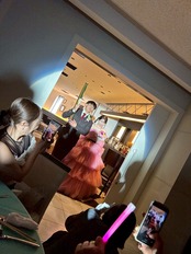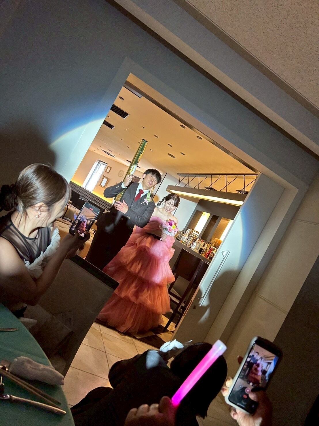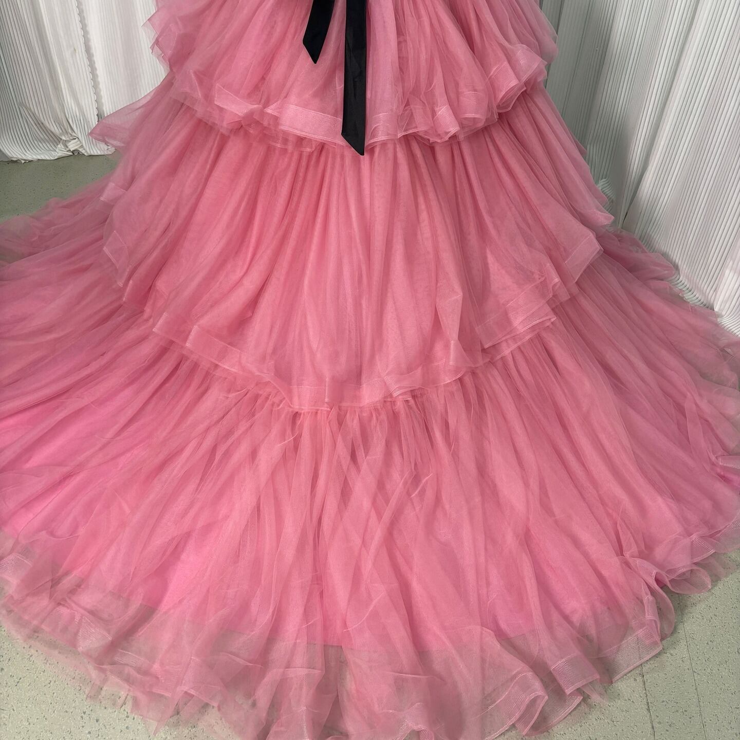 実例写真!カラードレス ピンク オフショルダー サッシュベルト 編み上げ ティアードのドレス 結婚式