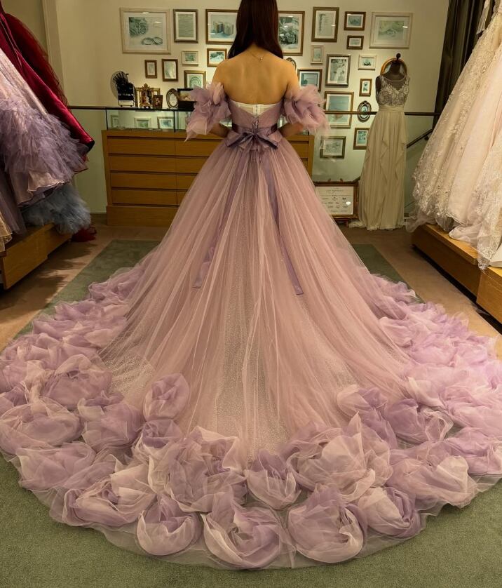 カラードレス ピンク フリル袖 サッシュベルト バラトレーン 華やかなトレーン 編み上げ 花嫁