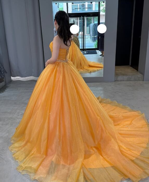 カラードレス オレンジ ソフトチュール 編み上げ キラキラグリッターチュール 華やかなトレーン ビスチェドレス 花嫁