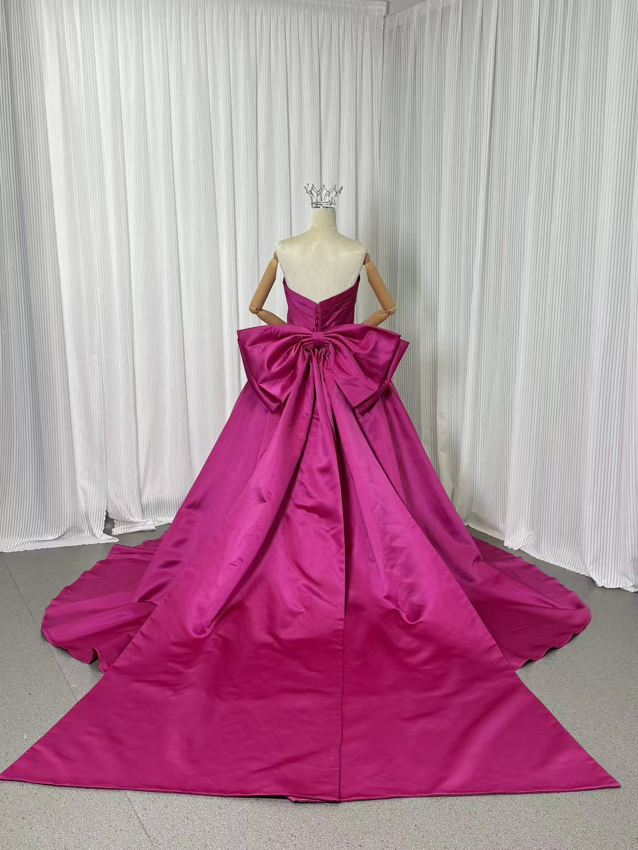 カラードレス ビビッドピンク ふっくら柔らかなバックリボン 光沢サテン スリット 編み上げ 華やかなトレーン 結婚式