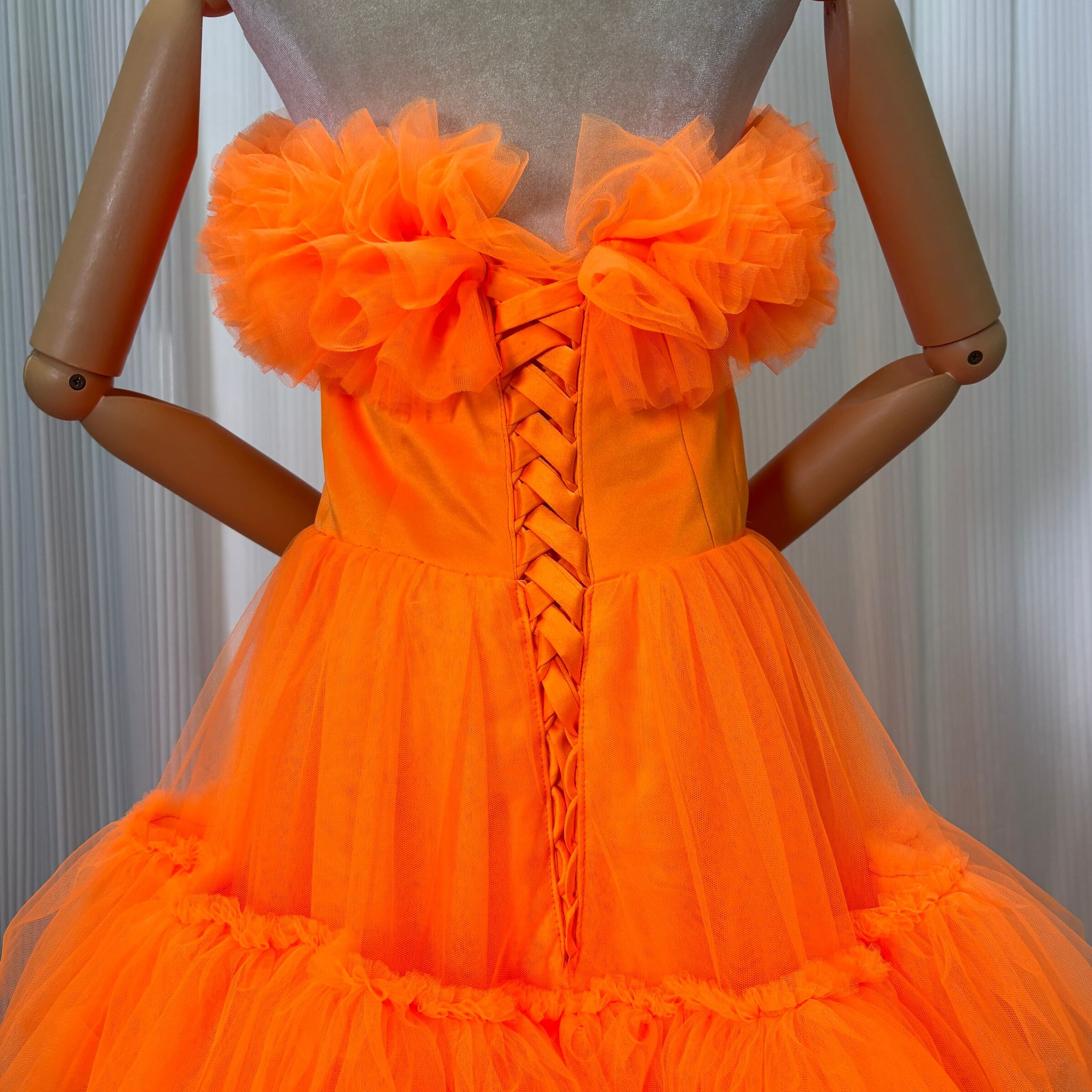 カラードレス オレンジ フロントスリット もこもこドレス ミニトレーン 編み上げ ビスチェドレス 花嫁