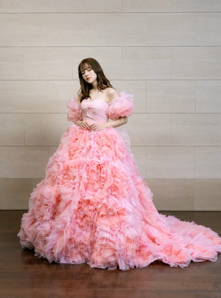 カラードレス ピンク 取り外し可能な付け袖 プリンセスライン 編み上げ 華やかなトレーン バラトレーン もこもこドレス 花嫁