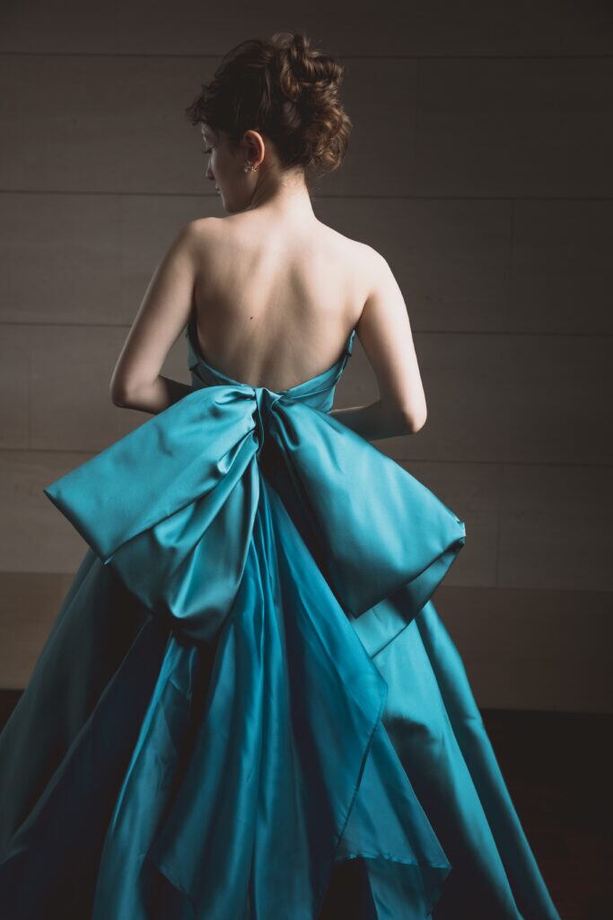 カラードレス ブルー 取り外し可能なオフショルダー ふっくら柔らかなバックリボン スリット 光沢サテン 華やかなトレーン 花嫁