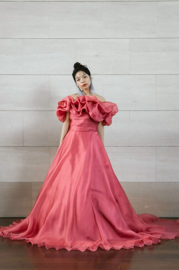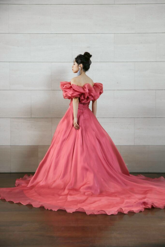 カラードレス ピンク 取り外し可能なオフショルダー 上質オーガンジー 華やかなトレーン 色直し 花嫁