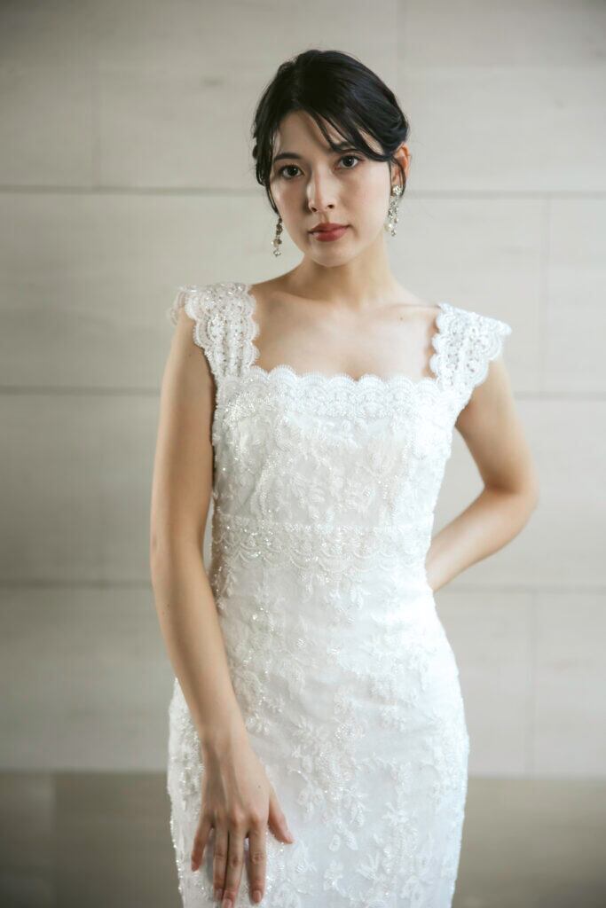 ウエディングドレス オフホワイト キャミソール 贅沢な総レース スクエアネック トレーン 結婚式 前撮り