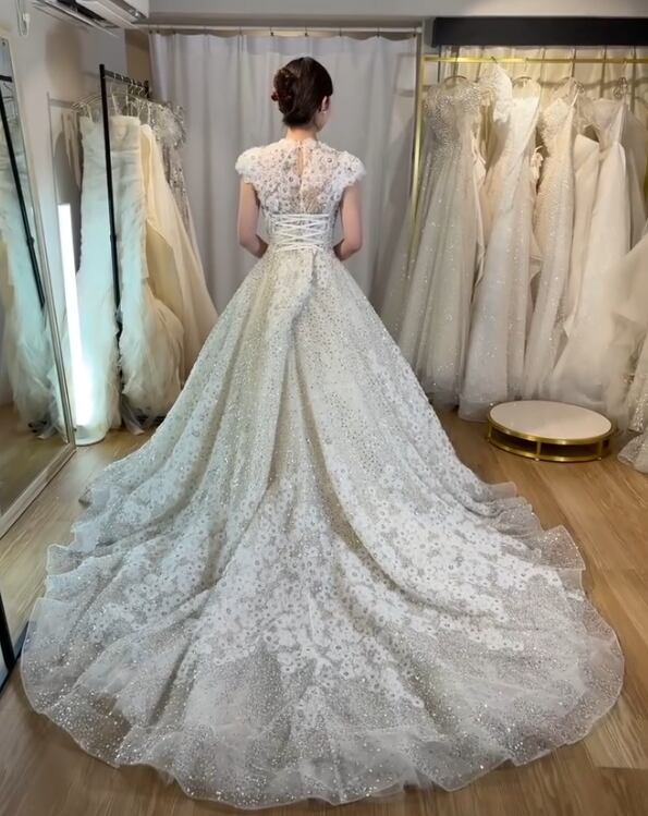ウエディングドレス オフホワイト 韓国風ドレス 魅惑の花レース ラウンドネック 編み上げ キラキラのハンドビーディング 華やかなトレーン 結婚式