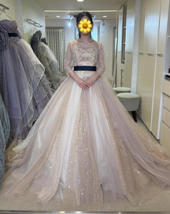 カラードレス あんず色 七分袖丈 ラウンドネック サッシュベルト シークインチュール 華やかなトレーン 花嫁
