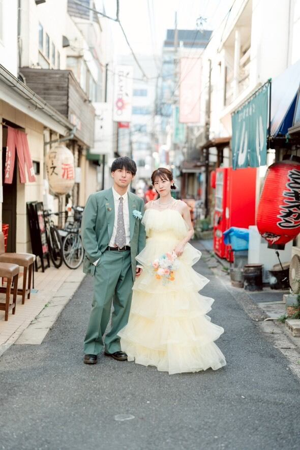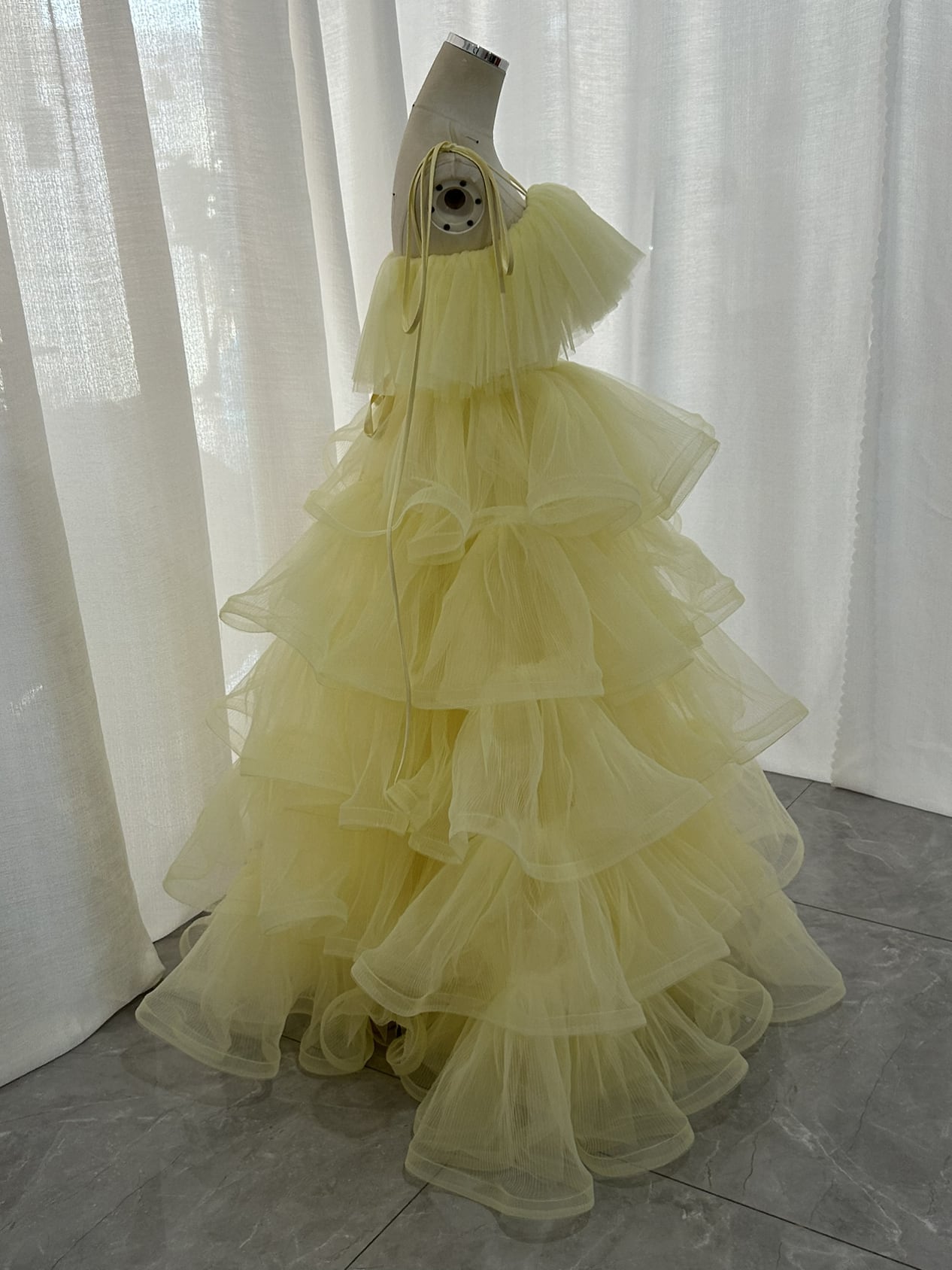 実例写真!カラードレス パステルイエロー キャミソール ロング ティアードのドレス 花嫁 前撮り